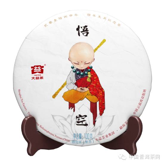 而大益的悟空整體包裝看上去很詼諧可愛,顯得很萌。但可以一目了然,棉紙清楚寫著悟空,在悟空兩個字中間有一個小和尚坐在一朵大大蓮花上好像真的在覺悟,他身后還有他的金箍棒。孫悟空是古典名著《西游記》中的主角,開始是美猴王出世,接著他大鬧天宮,后來在西天取經(jīng)的路上他斬妖除魔,對他的印象很深,勾起了兒時的各種回憶。孫悟空生性聰明、活潑、忠誠、嫉惡如仇,在中國民間文化中成為了機(jī)智與勇敢的化身,中國人將它奉為神明。左側(cè)有大益的logo。最下面標(biāo)明了凈含量100克和普洱熟茶。最上面寫著“貳零壹陸丙申年,猴年生肖紀(jì)念茶”。悟空,青蓮為臥,正坐中央,平靜、智慧,形態(tài)小巧、精致特別?!懊篮锿酢本褪侵腥A民族耳熟能詳?shù)纳裨捜宋铮陨裢◤V大而聞名于世。但是總得就一個悟空,沒有背景顏色和圖案,未免顯得有些單調(diào)。美猴王之美,在于他不懼威權(quán),不離不棄亦能大徹大悟,扭轉(zhuǎn)乾坤的精神,其氣概充呼天地。貳零壹陸為中國農(nóng)歷猴年,時遇中國破局之年,革新之年,大益美猴乾坤紅火現(xiàn)世,以逆轉(zhuǎn)紀(jì)元之罡正大氣。