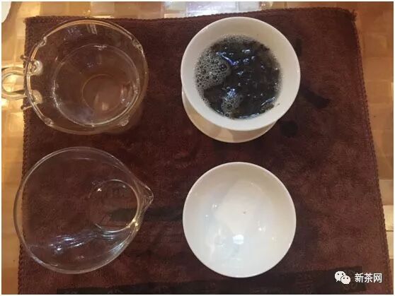 快速洗茶一道,水入水出,觀察洗茶水,除去碎茶片,洗茶水清澈透底,不渾濁,可見茶品衛(wèi)生環(huán)節(jié)良好。