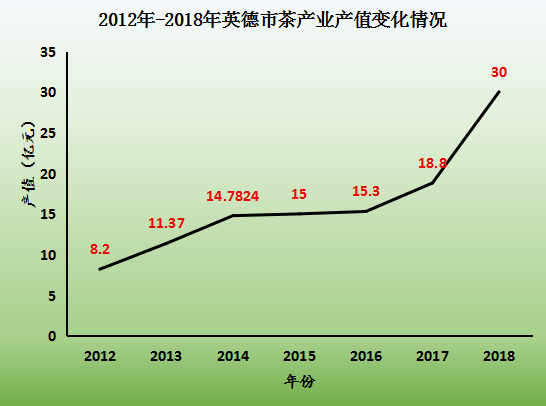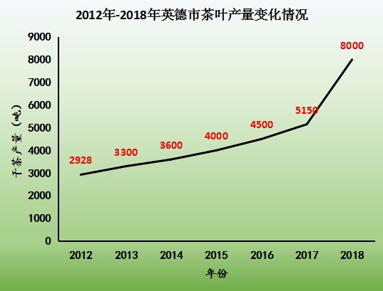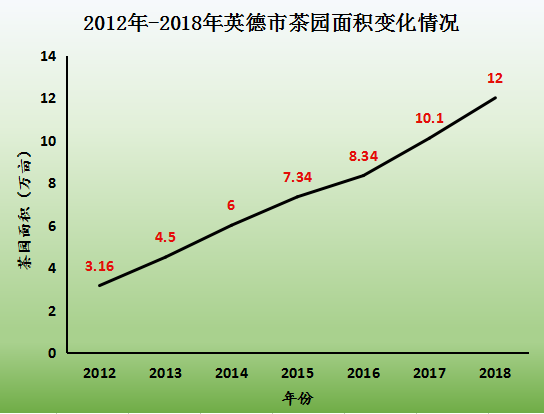 圖 2012年至2018年期間,英德全市茶產(chǎn)業(yè)迅速發(fā)展,茶園面積從2012年的3.16萬畝預(yù)計增長到2018年的12萬畝,干茶產(chǎn)量由2012年的2371噸預(yù)計增長到2018年的8000噸,產(chǎn)值由2012年的8.2億元預(yù)計增長到2018年的30億元。
