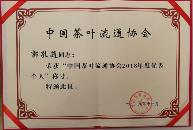 “中國茶葉流通協(xié)會2018年度優(yōu)秀個人”稱號