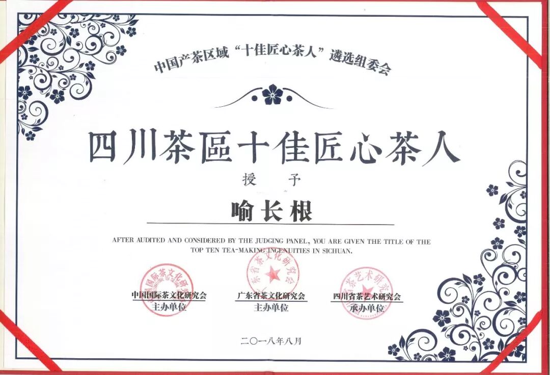 今年5月,由中國(guó)國(guó)際茶文化研究會(huì)、廣東省茶文化研究會(huì)和全國(guó)十四個(gè)省市涉茶組織共同發(fā)起了“中國(guó)產(chǎn)茶區(qū)(四川)十佳匠心茶人”評(píng)選活動(dòng)。周啟秀、喻長(zhǎng)根、高永川等十位“四川茶人”入選名單。本次評(píng)選由30名全國(guó)知名評(píng)審專家,經(jīng)歷4個(gè)月的細(xì)致走訪和嚴(yán)格篩選,極具權(quán)威性和嚴(yán)肅性,入選者都是身負(fù)絕技的資深茶人。