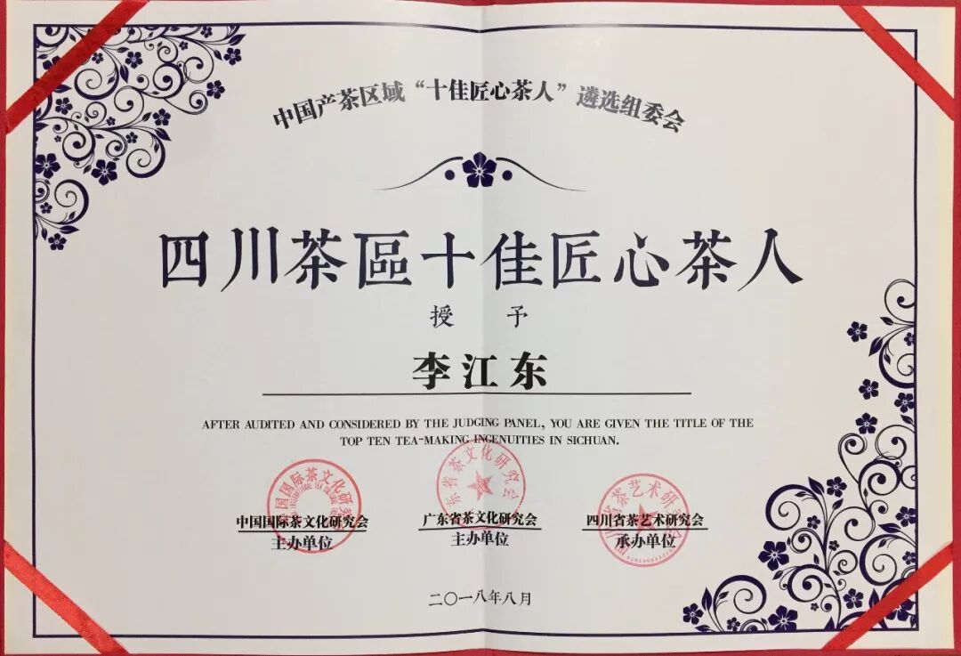 今年5月,由中國國際茶文化研究會、廣東省茶文化研究會和全國十四個省市涉茶組織共同發(fā)起了“中國產(chǎn)茶區(qū)(四川)十佳匠心茶人”評選活動。李江東、周啟秀、喻長根、高永川等十位“四川茶人”入選名單。本次評選由30名全國知名評審專家,經(jīng)歷4個月的細(xì)致走訪和嚴(yán)格篩選,極具權(quán)威性和嚴(yán)肅性,入選者都是身負(fù)絕技的資深茶人。