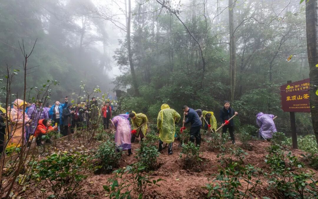 授牌儀式后,“2018年蒙頂山植茶節(jié)”在蒙頂山陰陽石麒麟牌坊邊的茶園正式啟幕。與會嘉賓在著名茶文化專家、四川省茶藝術(shù)研究會顧問蔣昭義和碧潭飄雪創(chuàng)始人、四川省茶藝術(shù)研究會名譽(yù)會長徐金華兩位80多歲“老茶人”的帶領(lǐng)下,親手種下茶樹并掛上自己的名字牌。嘉賓們紛紛表示,以后每年春天都將重返蒙頂山,探訪自己植下的“蒙頂仙茶”。