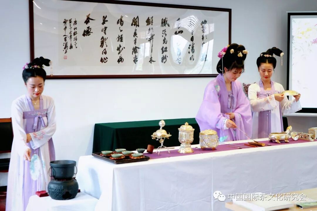 唐代煮茶在湖州市技能大師工作室領(lǐng)辦人、紫筍茶非遺傳承人楊亞靜指導下,由王燕、潘影、師嬌演示。