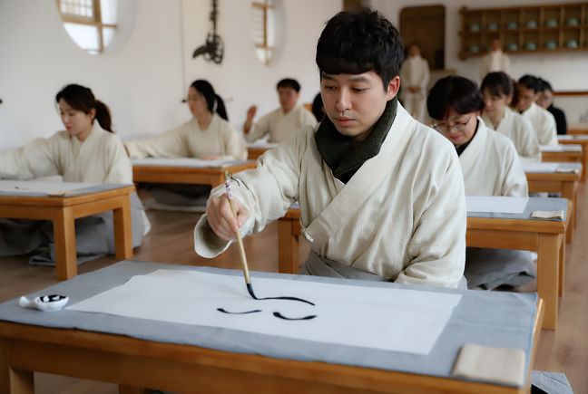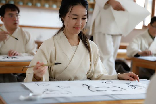 在茶密學堂校長靈心老師的帶領(lǐng)下,韓國訪問團一行對學堂進行了參觀,當聽到禪茶修養(yǎng)功法對身心的好處時,紛紛贊嘆,詢問中國禪修養(yǎng)有沒有發(fā)展到韓國,當?shù)弥陧n國濟洲島中國禪“不二海外修養(yǎng)中心”可以去修養(yǎng)時,大家表示回國后一定要去看一看。在觀看了茶密學堂修養(yǎng)團“凌波書法”功夫展示后,訪問團表示很震撼!