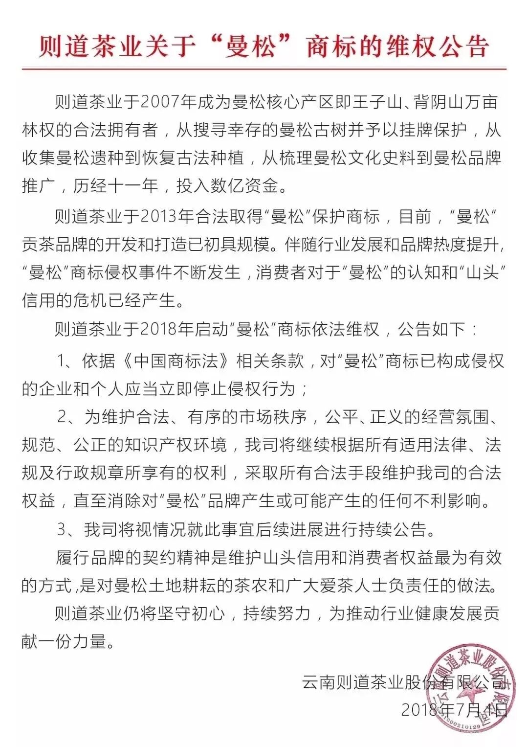 2018年初,則道借由其天貓官方旗艦店正式發(fā)售曼松貢茶之際,首次發(fā)布“曼松”商標(biāo)維權(quán)公告。