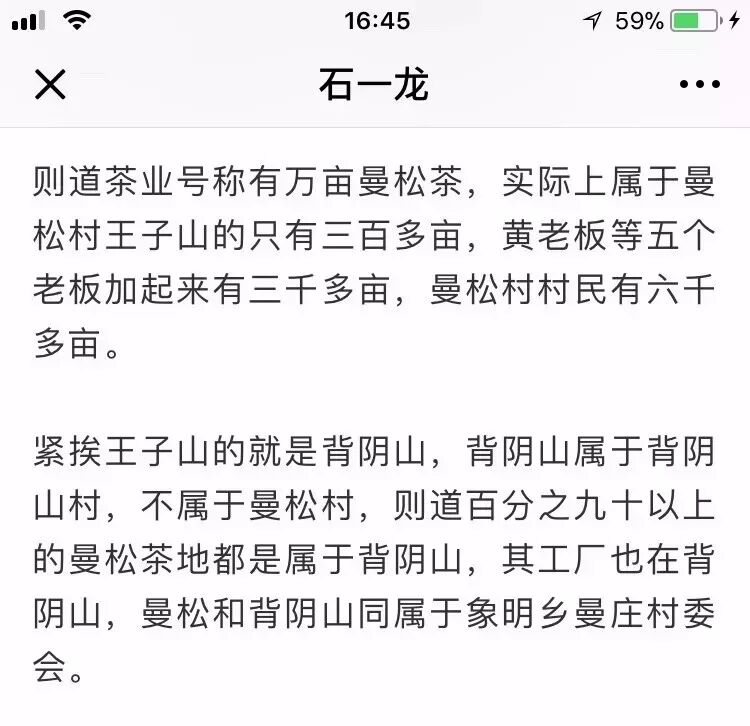 石一龍?jiān)诎l(fā)表的文章《則道意圖將曼松據(jù)為己有—老百姓不答應(yīng)》中說到:則道茶業(yè)號(hào)稱有萬畝曼松茶,實(shí)際上屬于曼松村王子山的只有三百多畝,黃老板等五個(gè)老板加起來有三千多畝,曼松村村民有六千多畝。緊挨王子山的就是背陰山,背陰山屬于背陰山村,不屬于曼松村,則道百分之九十以上的曼松茶地都是屬于背陰山,其工廠也在背陰山,曼松和背陰山同屬于象明鄉(xiāng)曼莊村委會(huì)。