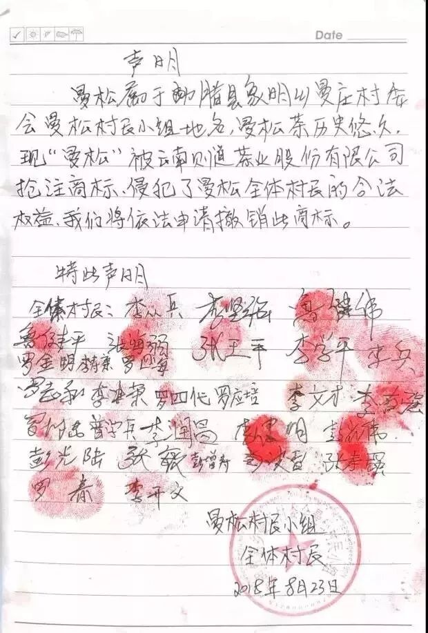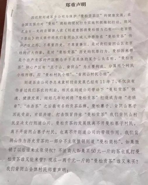 村民甲乙丙丁等人聯(lián)名發(fā)聲明:云南則道茶業(yè)有限公司搶注“曼松”商標(biāo),侵犯了曼松全體村民的合法權(quán)益,我們將依法申請(qǐng)撤銷此商標(biāo)。