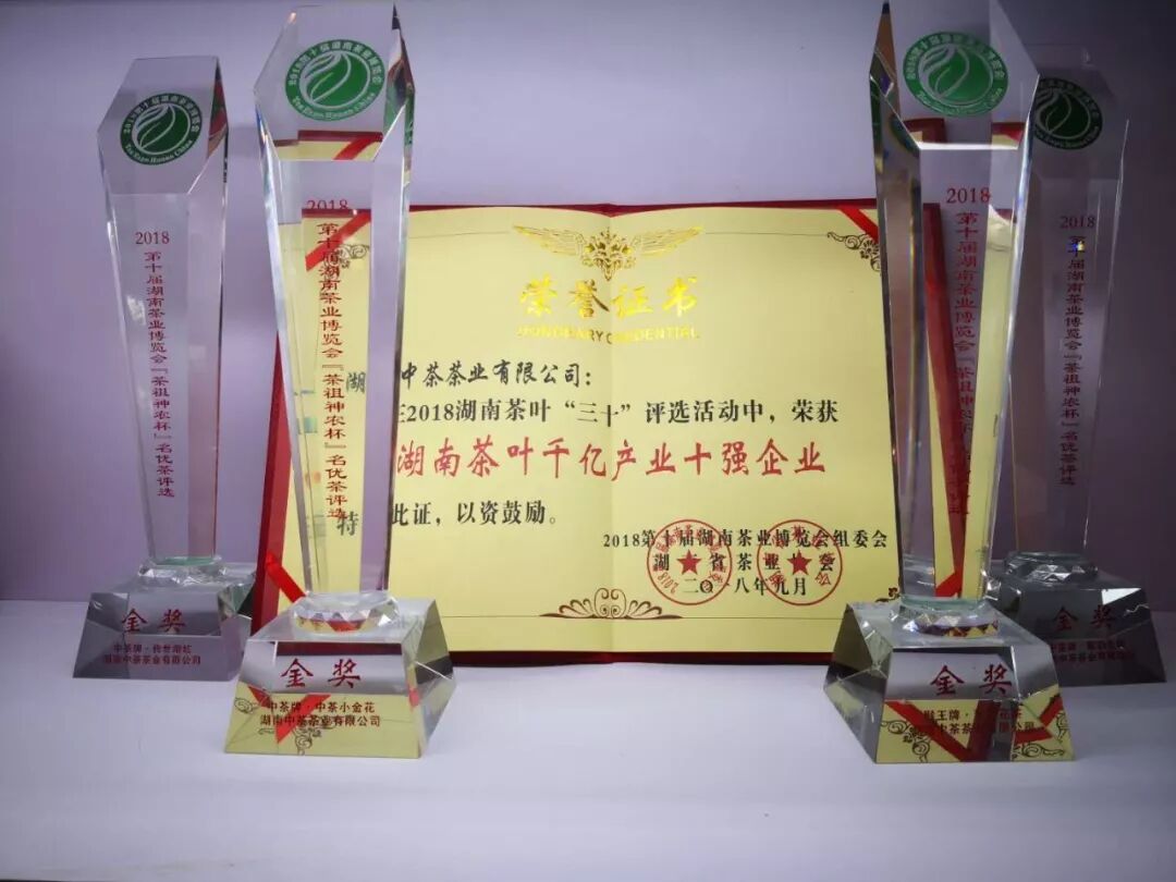 作為國(guó)家農(nóng)業(yè)產(chǎn)業(yè)化龍頭企業(yè),湖南中茶不僅將2018湖南茶葉“千億產(chǎn)業(yè)十強(qiáng)企業(yè)”獎(jiǎng)牌收入囊中,更在2018第十屆湖南茶博會(huì)"茶祖神農(nóng)杯"名優(yōu)茶評(píng)選中獨(dú)占鰲頭,公司選送的中茶牌·傳世湖紅、中茶小金花、陳韻金磚、中茶金猴王甄選茉莉花茶分別榮獲2018第十屆湖南茶博會(huì)"茶祖神農(nóng)杯"名優(yōu)茶評(píng)比紅茶、黑茶、特種茶類(lèi)金獎(jiǎng),繼香港國(guó)際名茶比賽包攬前三甲之后,湖南中茶一舉斬獲4項(xiàng)金獎(jiǎng),再次以?xún)?yōu)厚品質(zhì)向消費(fèi)者證明,國(guó)飲中茶,值得信賴(lài)。