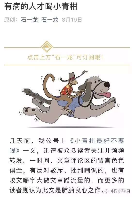 啖茶論道公眾號發(fā)布原創(chuàng)文章《“有病的人才喝小青柑”?石一龍,你太會嘩眾取寵了》;