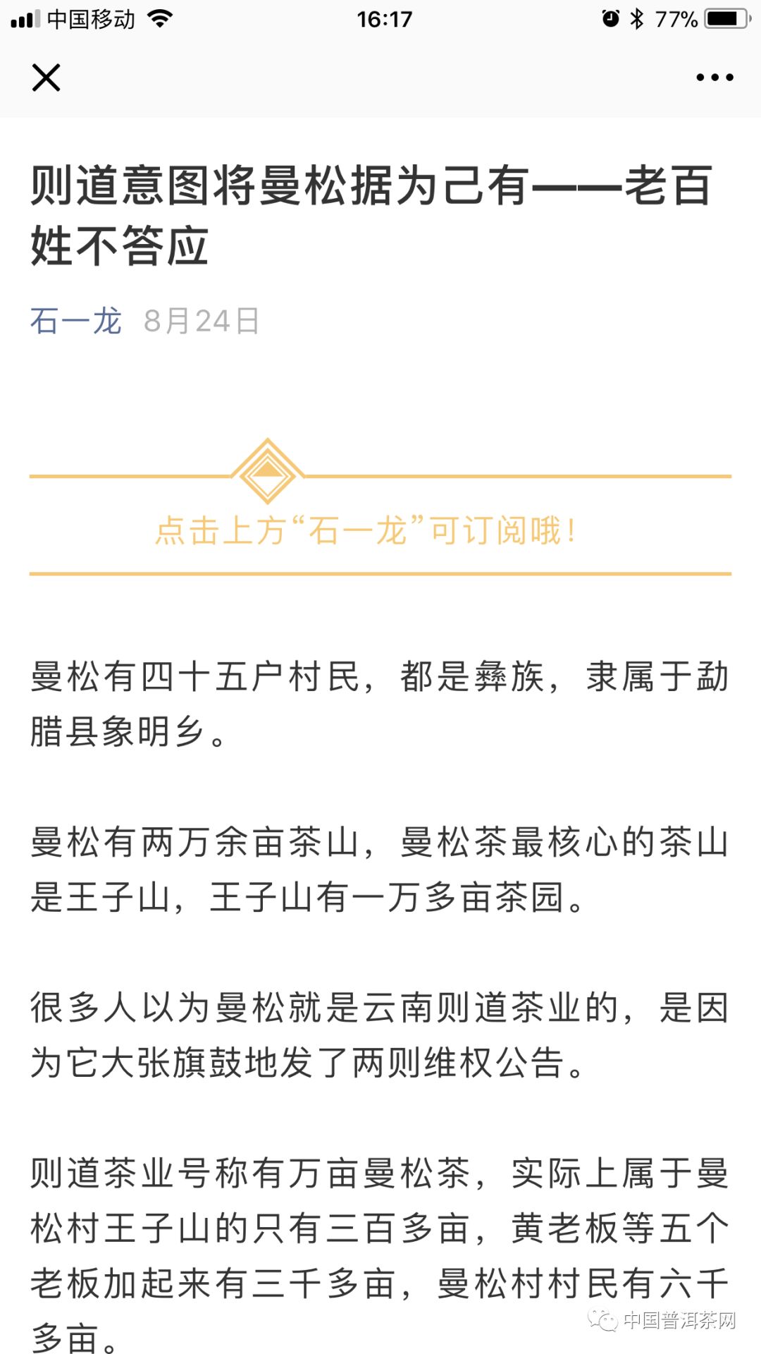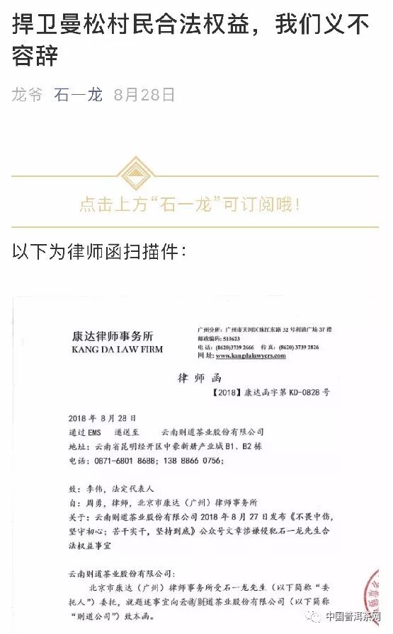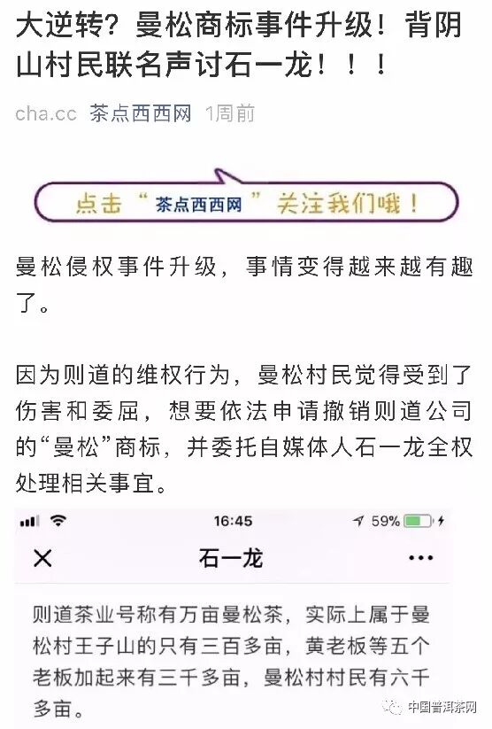 9月1日,茶情報、茶點(diǎn)西西兩家公眾號先后發(fā)布《大逆轉(zhuǎn)?曼松商標(biāo)事件升級!背陰山村名聯(lián)名聲討石一龍!》;