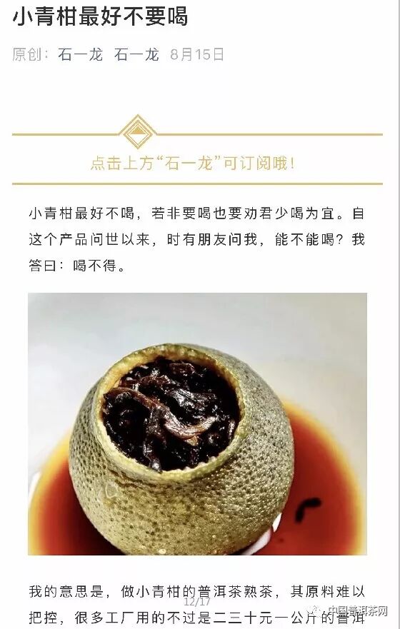 8月21日,讀茶記公眾號發(fā)布原創(chuàng)《有病的人才喝小青柑?喝普洱茶的人才是真正的病人》;