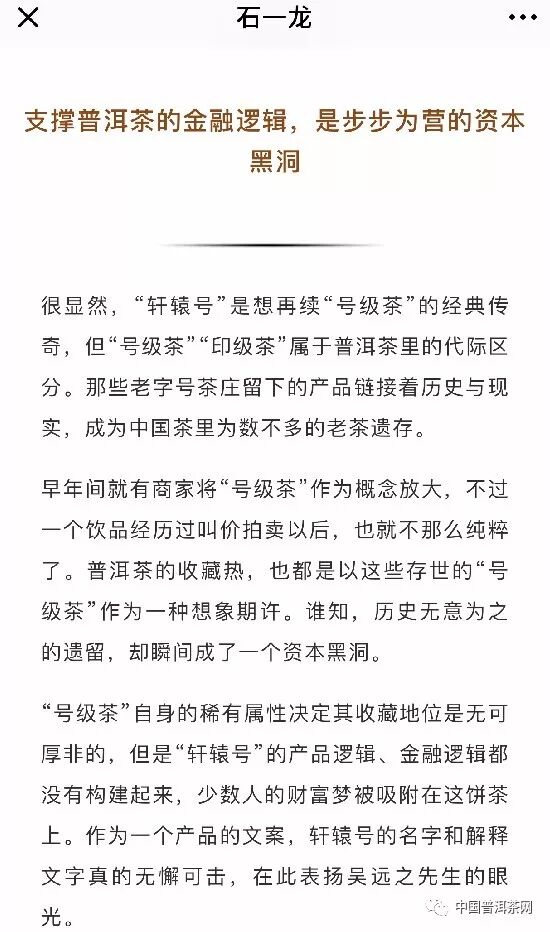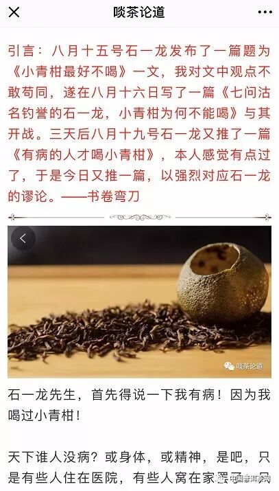 啖茶論道公眾號發(fā)布《七問沽名釣譽(yù)的石一龍,小青柑為什么不能喝?》;