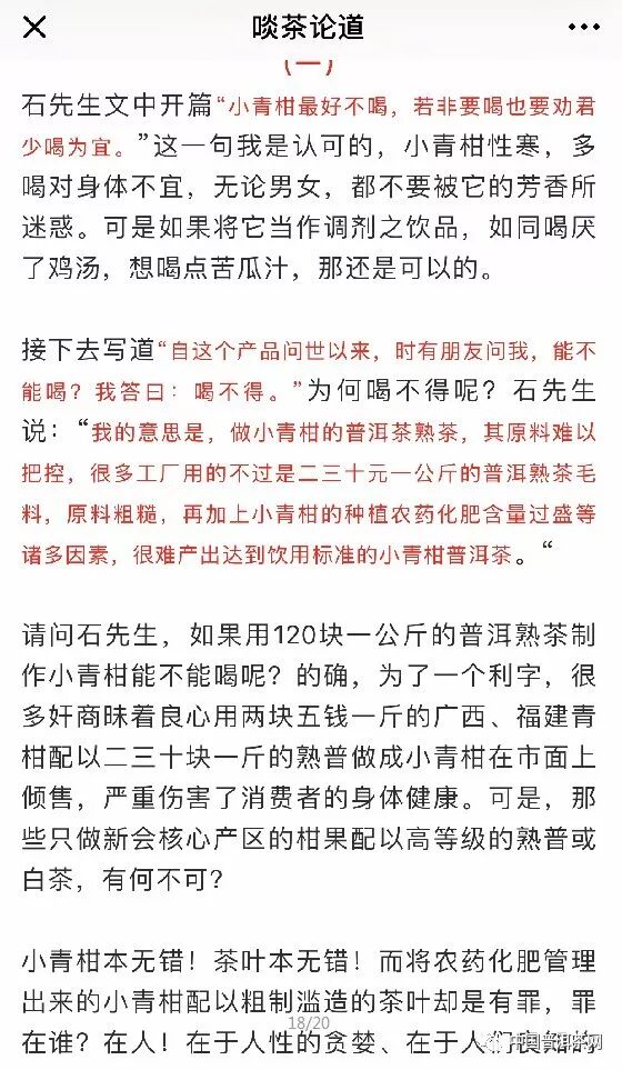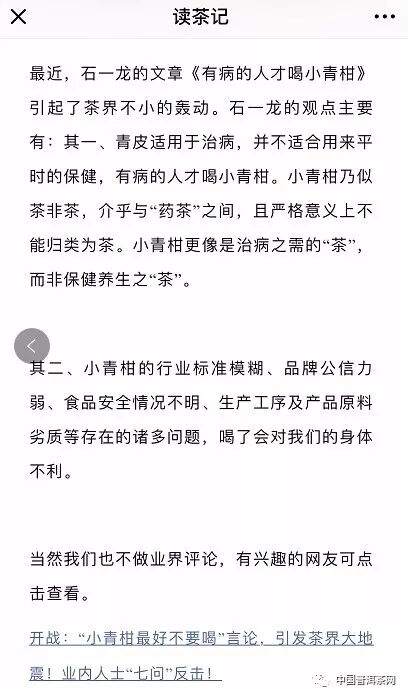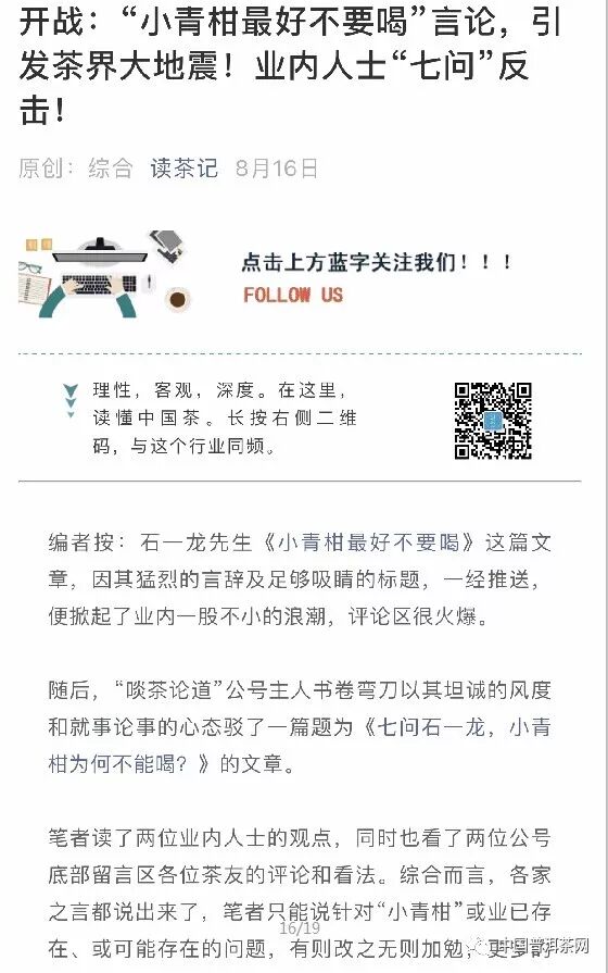 8月16日,讀茶記公眾號跟進(jìn)文章《開戰(zhàn):“小青柑最好不要喝”的言論,引發(fā)茶界大地震!業(yè)內(nèi)人士“七問”反擊》,