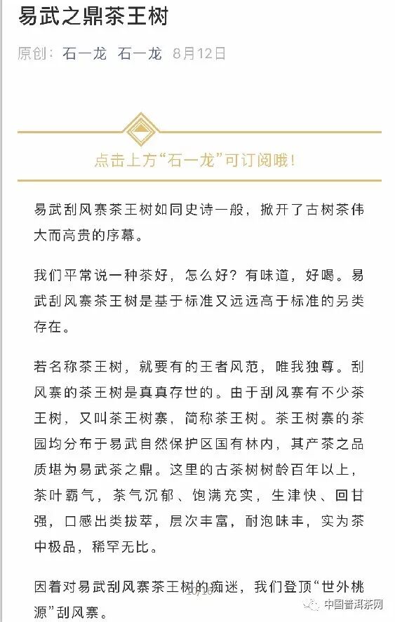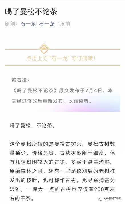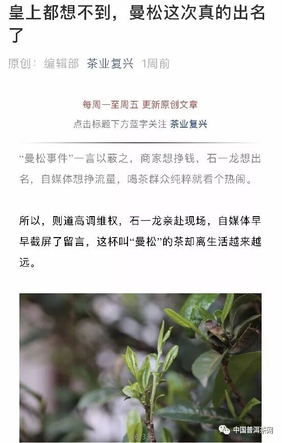 8月30日,茶業(yè)復(fù)興公眾號發(fā)布文章《皇上都想不到,曼松這次真的出名了》;