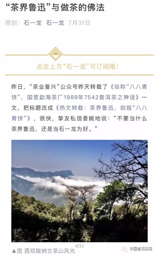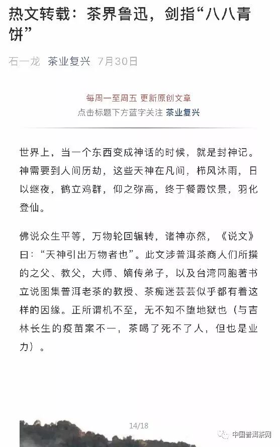 7月30日,茶業(yè)復(fù)興公眾號以《熱文轉(zhuǎn)載:茶界魯迅,劍指“八八青餅”》為題發(fā)布該文,首次提出“茶界魯迅”的稱呼;