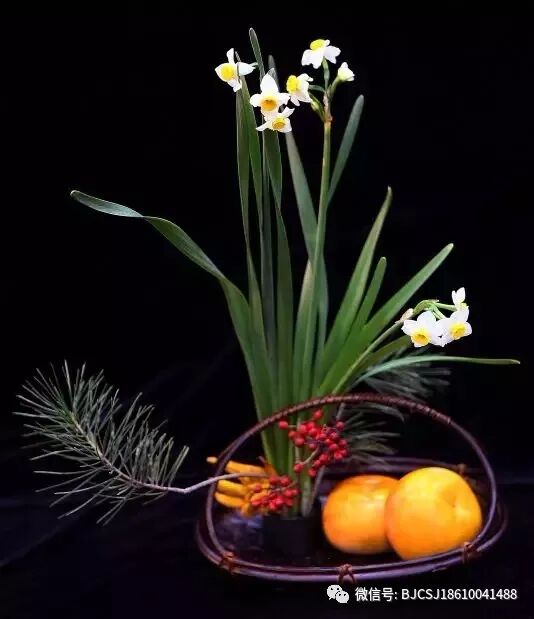 【寓意】作品靈感來(lái)自黃庭堅(jiān)的詩(shī)句“得水能仙天與奇,寒香寂寞動(dòng)冰肌。仙風(fēng)道骨今誰(shuí)有,淡掃蛾眉簪一枝。”借水開(kāi)花、玉骨冰肌的水仙花,又被稱為凌波仙子,它芳心塵外潔、道韻雪中香,是春節(jié)前后裝點(diǎn)家居的傳統(tǒng)花材,花型如金盞銀臺(tái),搭配喜慶的紅豆果、長(zhǎng)青的不老松、福氣滿滿的佛手、象征事事如意的柿子,有祝愿新年富貴祥瑞的美意。