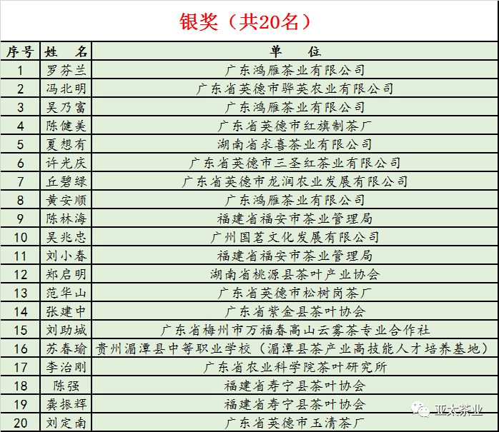 中國(guó)茶葉流通協(xié)會(huì)副會(huì)長(zhǎng)姚靜波,中國(guó)茶葉流通協(xié)會(huì)副會(huì)長(zhǎng)、廣東省茶葉行業(yè)協(xié)會(huì)會(huì)長(zhǎng)穆有為,中國(guó)茶葉流通協(xié)會(huì)副會(huì)長(zhǎng)王秀蘭,清遠(yuǎn)市農(nóng)業(yè)局局長(zhǎng)張偉杰,英德市委常委、宣傳部長(zhǎng)羅振宇共同為獲銀獎(jiǎng)選手頒獎(jiǎng)