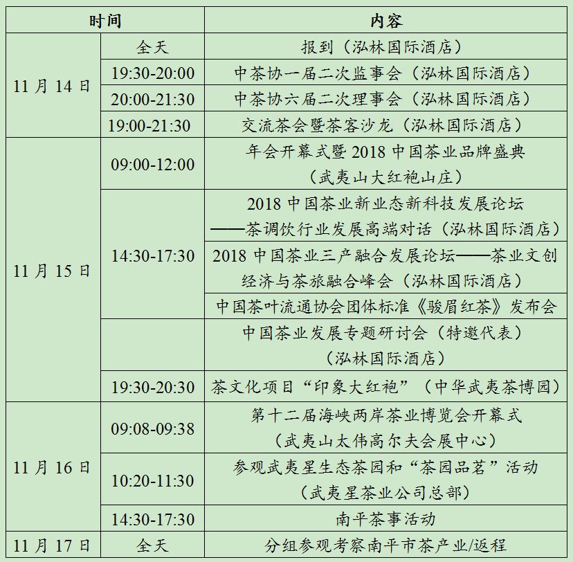 為深入貫徹習(xí)近平新時(shí)代中國(guó)特色社會(huì)主義思想和黨的十九大精神,全面展示2018年中國(guó)茶產(chǎn)業(yè)經(jīng)濟(jì)的輝煌成就,中國(guó)茶葉流通協(xié)會(huì)與福建省農(nóng)業(yè)廳、福建省供銷(xiāo)合作社聯(lián)合社、南平市人民政府定于2018年11月14-17日在福建省武夷山市舉行“第十四屆中國(guó)茶業(yè)經(jīng)濟(jì)年會(huì)”。