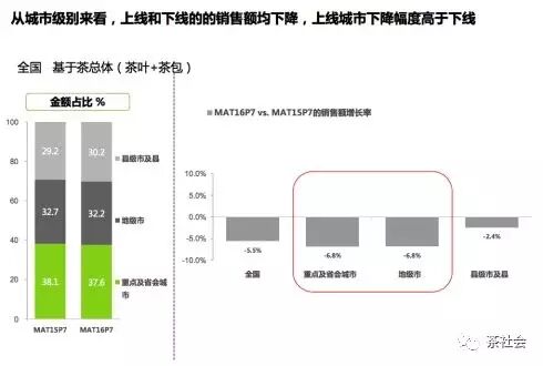 從凱度公布的調(diào)查結(jié)果來看,2016前7個(gè)月茶葉銷售占比約70%的大城市和地級市場下降了6.8%,銷量占比30%的縣級市場下降了2.4%。這與茶葉營銷堅(jiān)守所謂的“茶文化”有一定的關(guān)系,使得追求生活快節(jié)奏的年輕人漸行漸遠(yuǎn),茶葉消費(fèi)群體也從35%下降到了33.9%;與此相比,咖啡的消費(fèi)人群從12.5%提高到了14.1%。