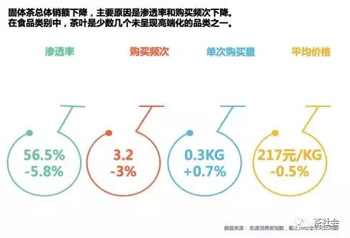 根據(jù)凱度指數(shù),截止到2016年上半年,固體茶的市場滲透率只有56.5%,同比下降5.8%,消費(fèi)者的平均購買頻次為3.2次/年,同比下降了3%,消費(fèi)者單次購買量0.3公斤/次,增長0.7%,產(chǎn)品平均價(jià)格217元/公斤,下降了0.5%。