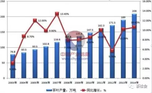 下面是近10年茶葉產(chǎn)量和增長情況圖:
