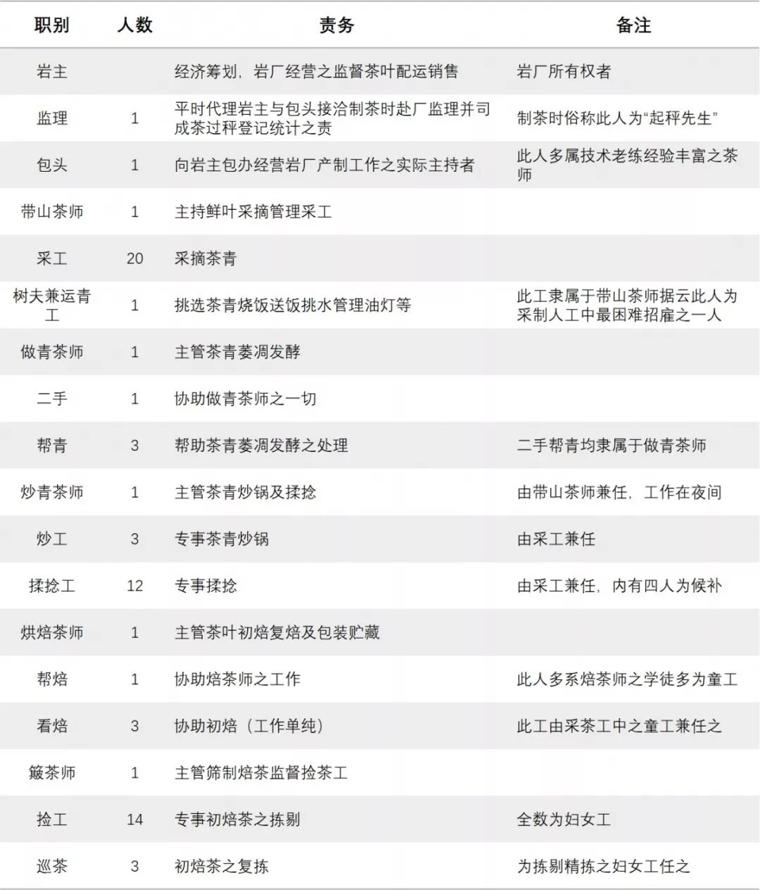 書中對巖茶的采制介紹詳細,內(nèi)容豐富,無法一一列舉,但從采制分工表格也可側面了解采制工作,故引用書中的“人工組織系統(tǒng)”表格(表中人數(shù)以制成茶一千斤為準):