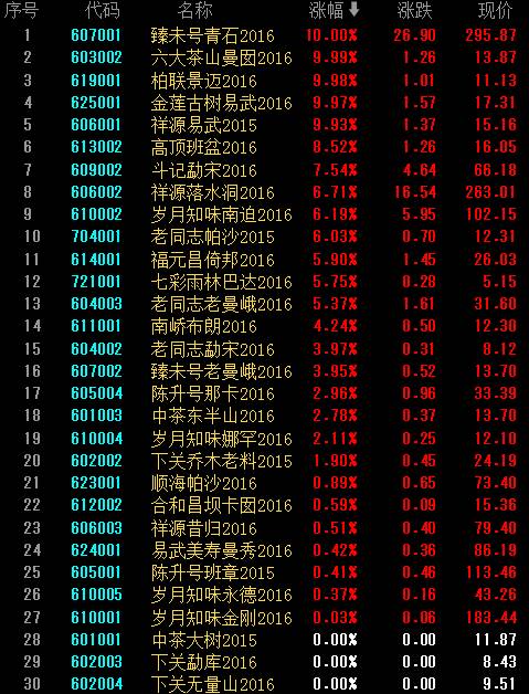 盤面上,市場今日27支藏品上漲,其中臻未號青石、六大茶山曼囡、柏聯(lián)景邁、金蓮古樹易武漲停;臻未號小景谷平盤報收;10支藏品臨時停牌;16支藏品下跌,其中斗記布朗跌停。
