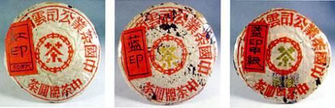 國(guó)營(yíng)茶廠出品的普洱茶餅,外包紙印有“中茶牌圓茶”和“中國(guó)茶業(yè)公司云南省公司”繁體中文字樣,以其中間“茶”字的顏色分別命名品種。分別有紅印、綠印、藍(lán)印、黃印四種。所以這一時(shí)期的出產(chǎn)的普洱茶,亦被稱之為“印級(jí)茶”。