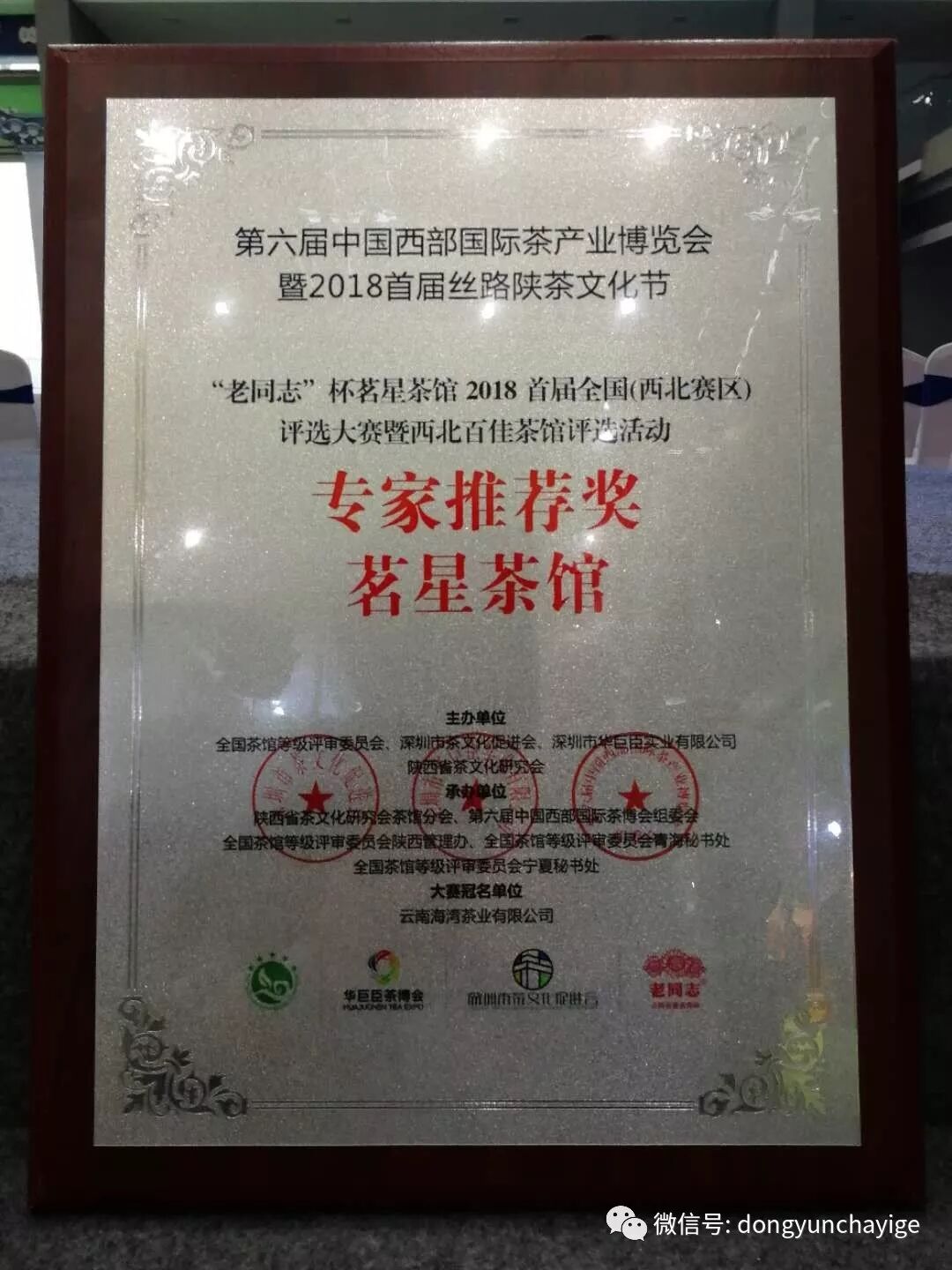感恩組委會(huì)及各界朋友們的支持,成就了東云的專家推薦獎(jiǎng)“茗星茶館”及2018西北百佳“最具影響力茶館”。
