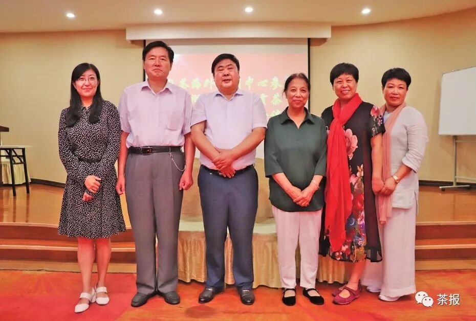 本報執(zhí)行主編(左一)與山東省茶文化協(xié)會會長侯國云女士(右三)、神龍國際貿(mào)易有限公司董事長樂子華(左三)、聊城市茶葉協(xié)會會長李乃輝(左二)等人合影