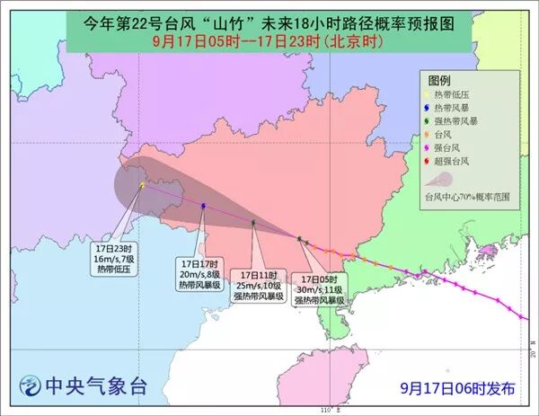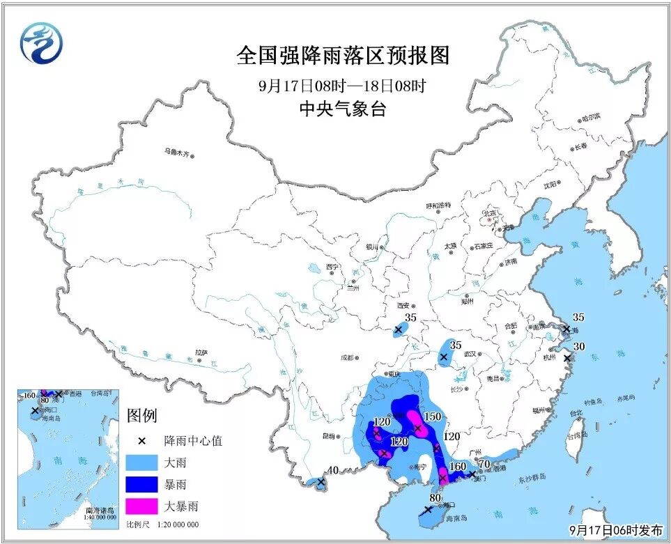預(yù)計(jì)9月17日08時(shí)至18日08時(shí),廣東南部、香港、澳門、海南島、廣西大部、湖南西部、貴州、重慶南部、云南東部和西南部等地有大到暴雨,其中,廣東西南部、廣西東部和北部、貴州南部等地的部分地區(qū)有大暴雨(100~160毫米);上述部分地區(qū)伴有短時(shí)強(qiáng)降水(小時(shí)雨量20~50毫米,最大可達(dá)70毫米以上),局地有雷暴大風(fēng)等強(qiáng)對(duì)流天氣。