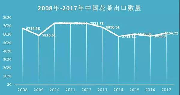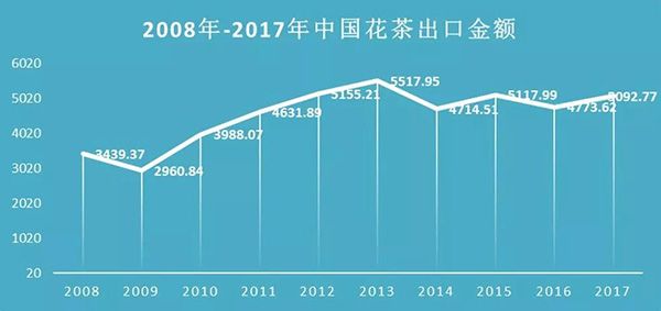 通過近十年中國花茶出口數(shù)據(jù),可以發(fā)現(xiàn):茉莉花茶的出口數(shù)量徘徊于5800-7400噸之間;2010年-2013年處于頂峰階段,2013年以后出口數(shù)量逐漸減少,2017年實現(xiàn)止跌回升,但仍比2008年減少了8%。而在出口金額上,則始終呈逐漸增長態(tài)勢;2017年茉莉花茶出口金額比2008年增長了48%,出口金額的增長主要得益于出口單價的提升。十年來,受原材料、人工費用持續(xù)攀升及人民幣升值因素影響,中國花茶的出口平均單價呈穩(wěn)步上升趨勢,僅在2016年比增略有回落;至2017年,茉莉花茶出口單價相較2008年已上升61%。