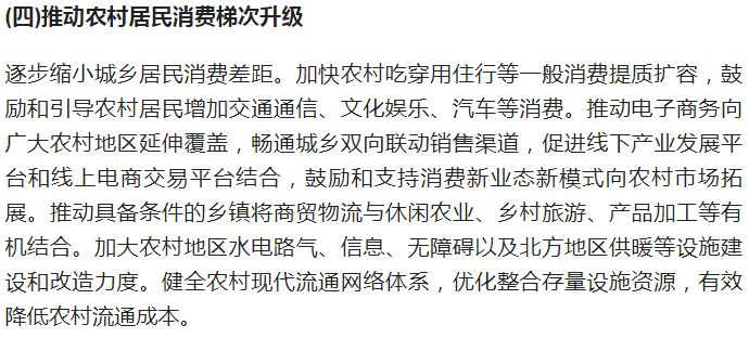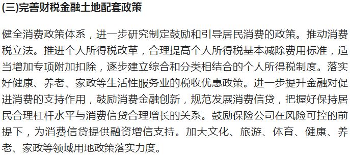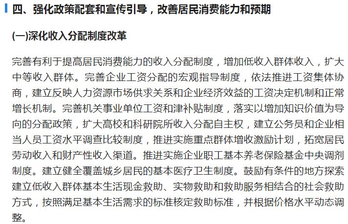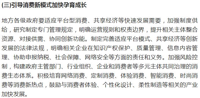 據(jù)新華社北京9月20日電稱:為完善促進(jìn)消費(fèi)體制機(jī)制,進(jìn)一步激發(fā)居民消費(fèi)潛力,中央發(fā)布“激發(fā)居民消費(fèi)潛力”意見。旨在堅(jiān)持以供給側(cè)結(jié)構(gòu)性改革為主線,適應(yīng)建設(shè)現(xiàn)代化經(jīng)濟(jì)體系,順應(yīng)居民消費(fèi)提質(zhì)轉(zhuǎn)型升級(jí)新趨勢(shì),依靠改革創(chuàng)新破除體制機(jī)制障礙,實(shí)行鼓勵(lì)和引導(dǎo)居民消費(fèi)的政策,從供需兩端發(fā)力,積極培育重點(diǎn)領(lǐng)域消費(fèi)細(xì)分市場(chǎng),全面營造良好消費(fèi)環(huán)境,不斷提升居民消費(fèi)能力,引導(dǎo)形成合理消費(fèi)預(yù)期,切實(shí)增強(qiáng)消費(fèi)對(duì)經(jīng)濟(jì)發(fā)展的基礎(chǔ)性作用,不斷滿足人民日益增長的美好生活需要。