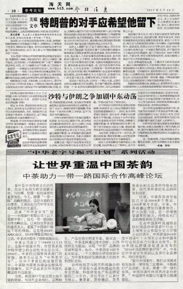 在近日召開的全球矚目的“一帶一路”國際合作高峰論壇上,我國唯一一家從事茶產(chǎn)業(yè)的“中華老字號”國企——中國茶葉有限公司(以下簡稱中茶),就用自己精選的四款茶葉產(chǎn)品,讓來自世界各國的嘉賓友人,重溫了中國茶葉綿延千年的神韻。