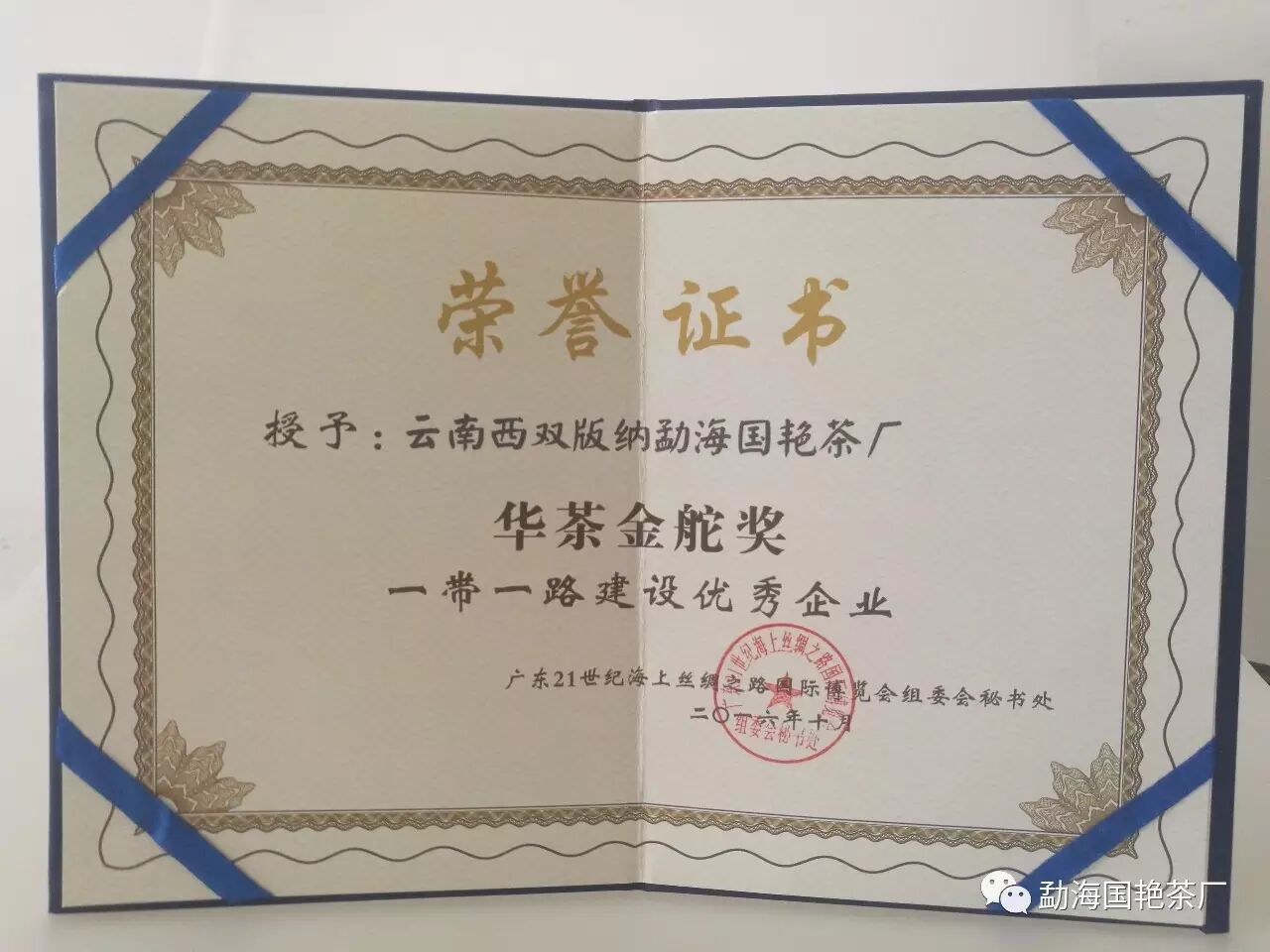 2016年10月30日,西雙版納勐海國(guó)艷茶廠憑借雄厚的實(shí)力,被“廣州21世紀(jì)海上絲綢之路國(guó)際博覽會(huì)”組委會(huì)授予華茶金舵獎(jiǎng)“一帶一路建設(shè)優(yōu)秀企業(yè)”!
