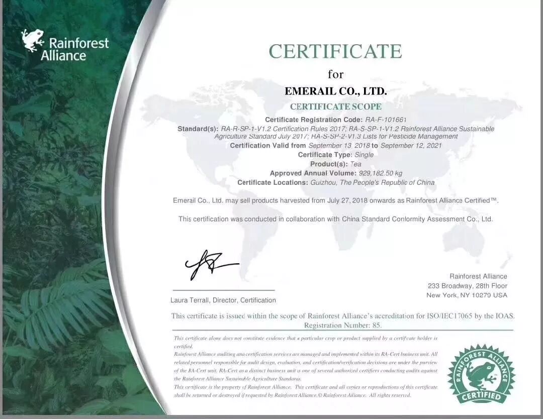 2018年9月13日,雨林聯(lián)盟美國(guó)紐約總部簽發(fā)了貴茶雨林認(rèn)證證書(shū)。