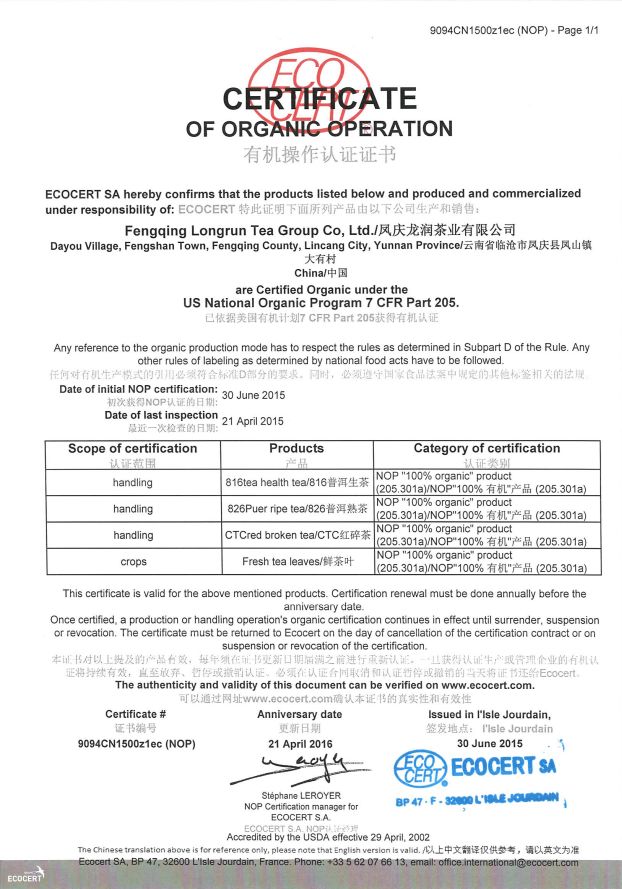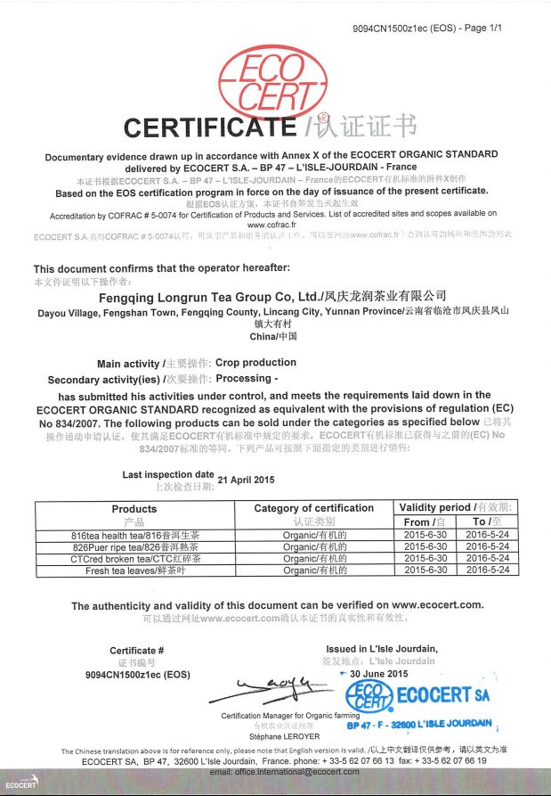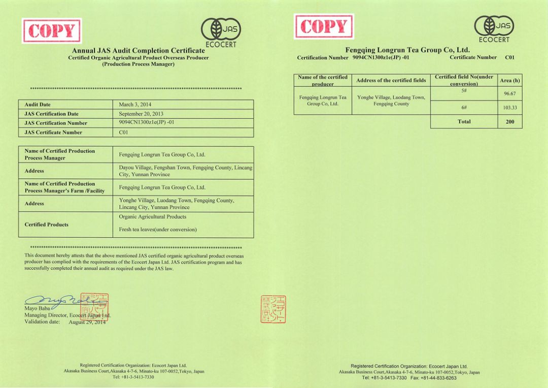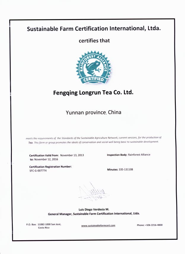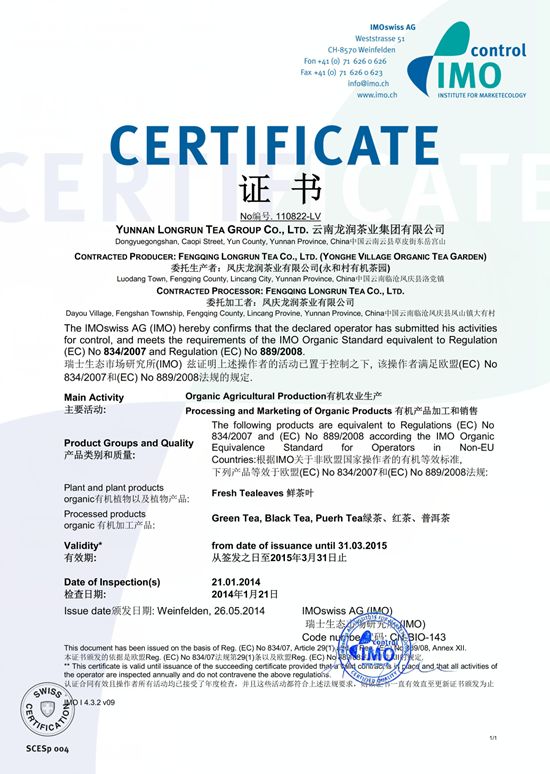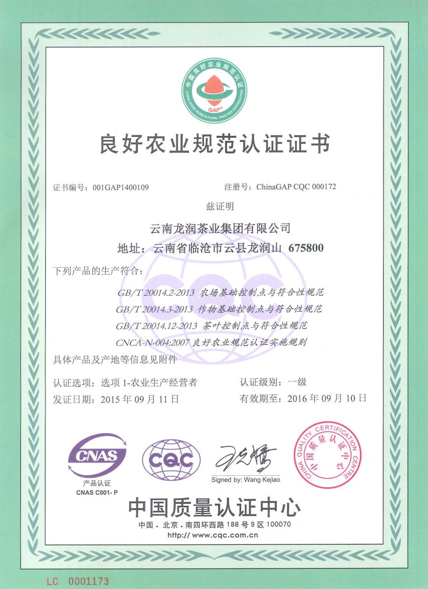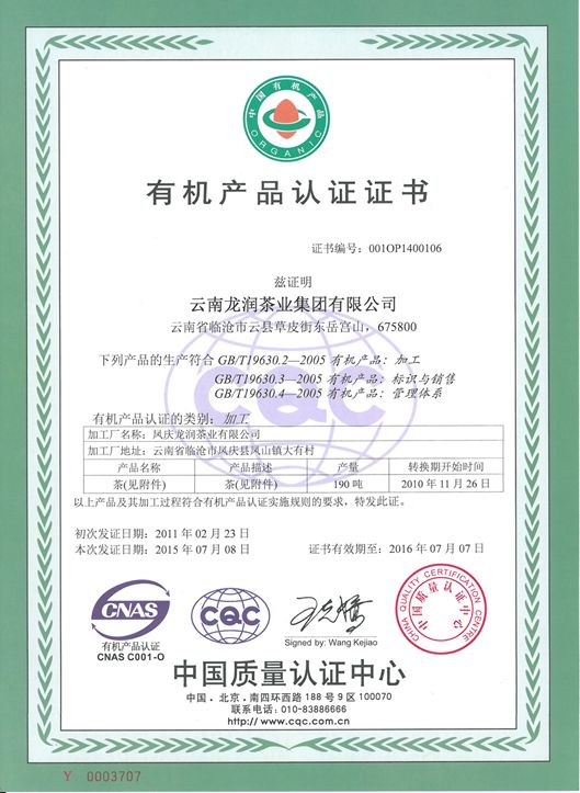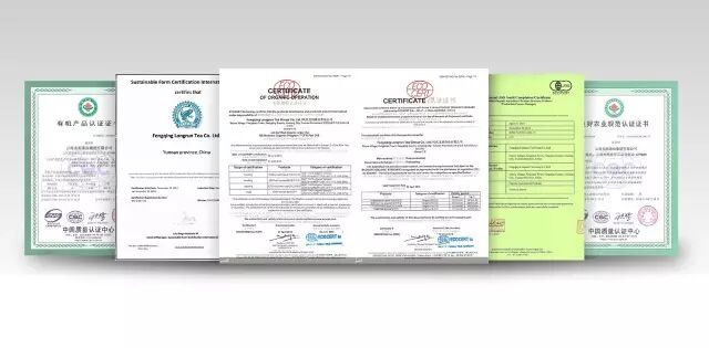 龍潤茶種植基地經(jīng)國家科技部、云南省科技廳、中國茶科所等部門及專家通過實(shí)地調(diào)查生態(tài)環(huán)境、栽培方式、加工條件,并將茶葉、土壤等抽樣帶回檢測,種植基地通過了“出口植物源性食品原料種植基地檢驗(yàn)檢疫備案”,相繼通過了歐盟有機(jī)認(rèn)證(ECO)、雨林聯(lián)盟認(rèn)證(RA)、美國有機(jī)認(rèn)證(NOP)、日本農(nóng)產(chǎn)品有機(jī)認(rèn)證(JAS)、良好農(nóng)業(yè)規(guī)范認(rèn)證(GAP)、中國有機(jī)認(rèn)證(CNAS)等,使生產(chǎn)過程在國際一流的嚴(yán)格管理控制下執(zhí)行,保證每一份產(chǎn)品傳遞到消費(fèi)者手中的是一份安心和放心。