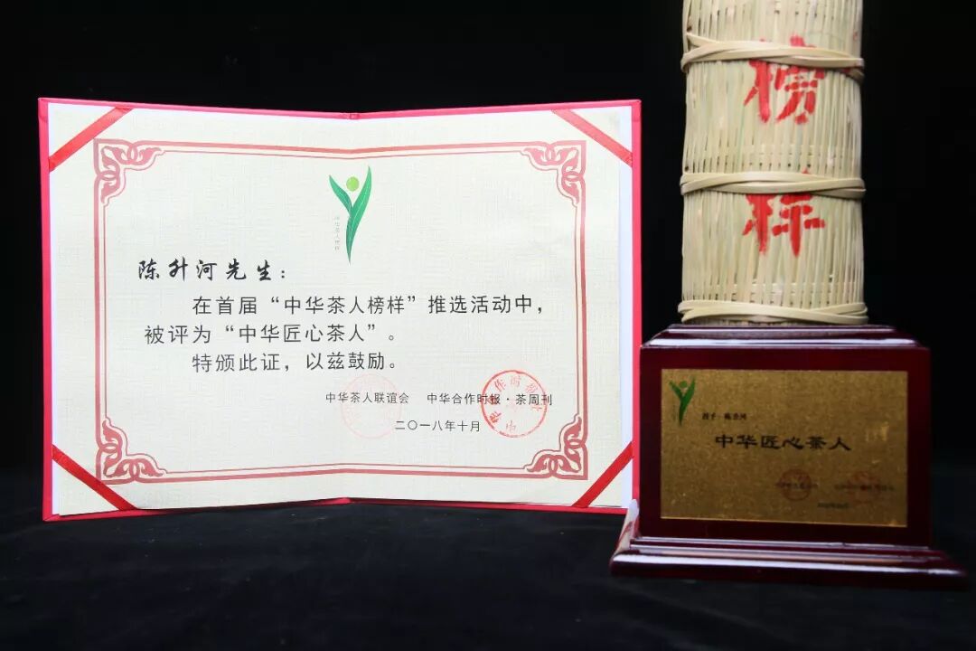 陳升河先生被評(píng)為“中華匠心茶人”證書和獎(jiǎng)杯