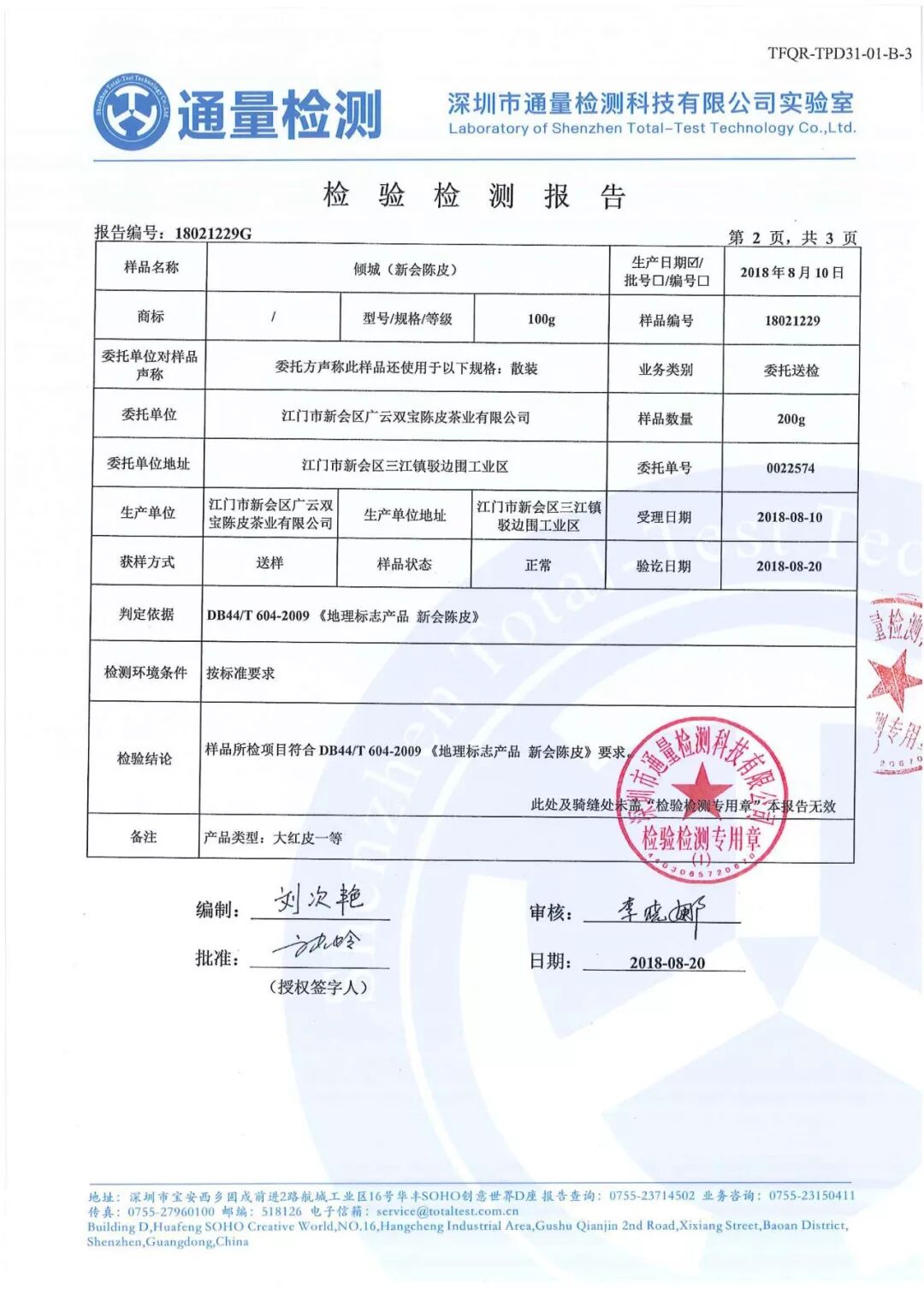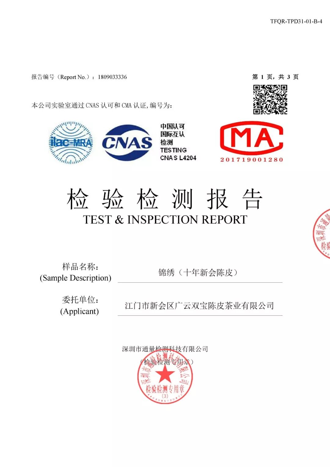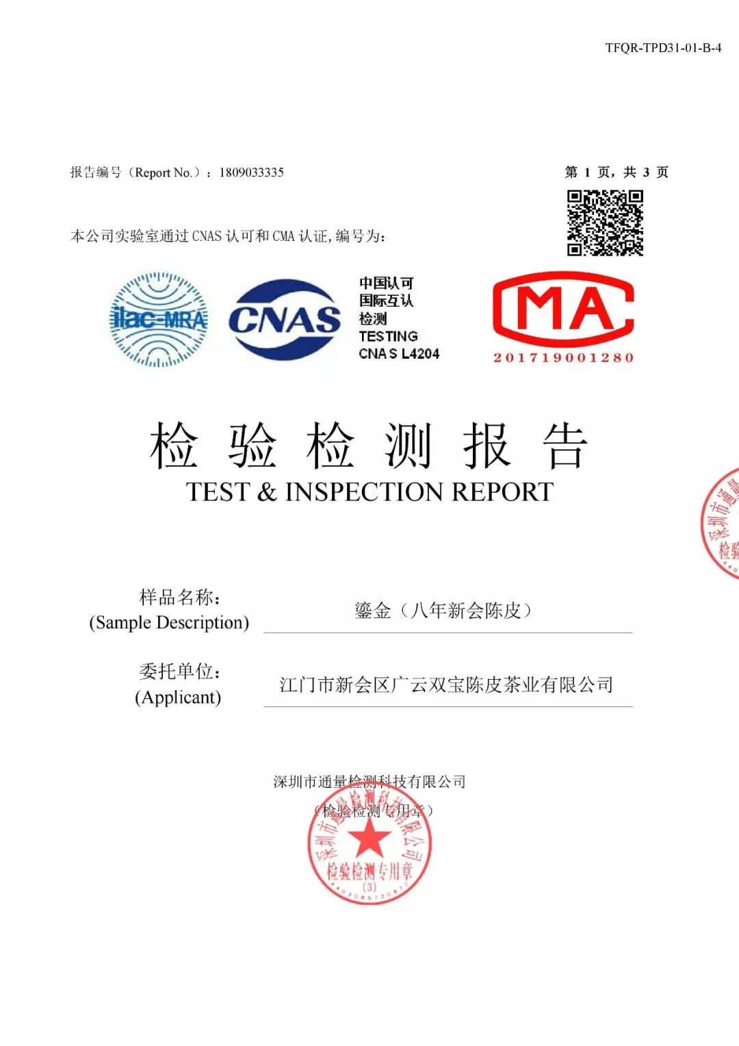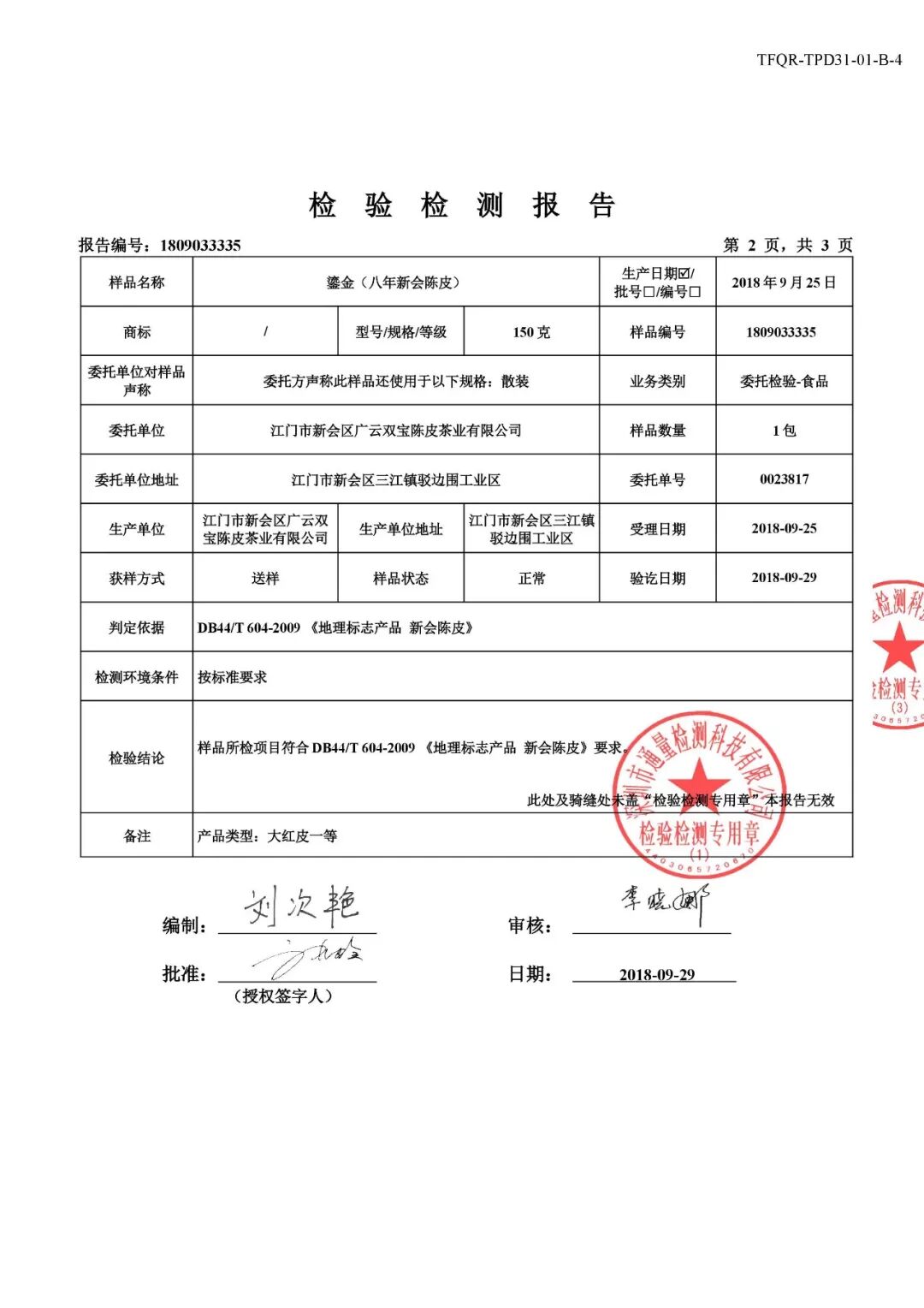 以下是廣云雙寶各款陳皮的質(zhì)檢證書呈現(xiàn):