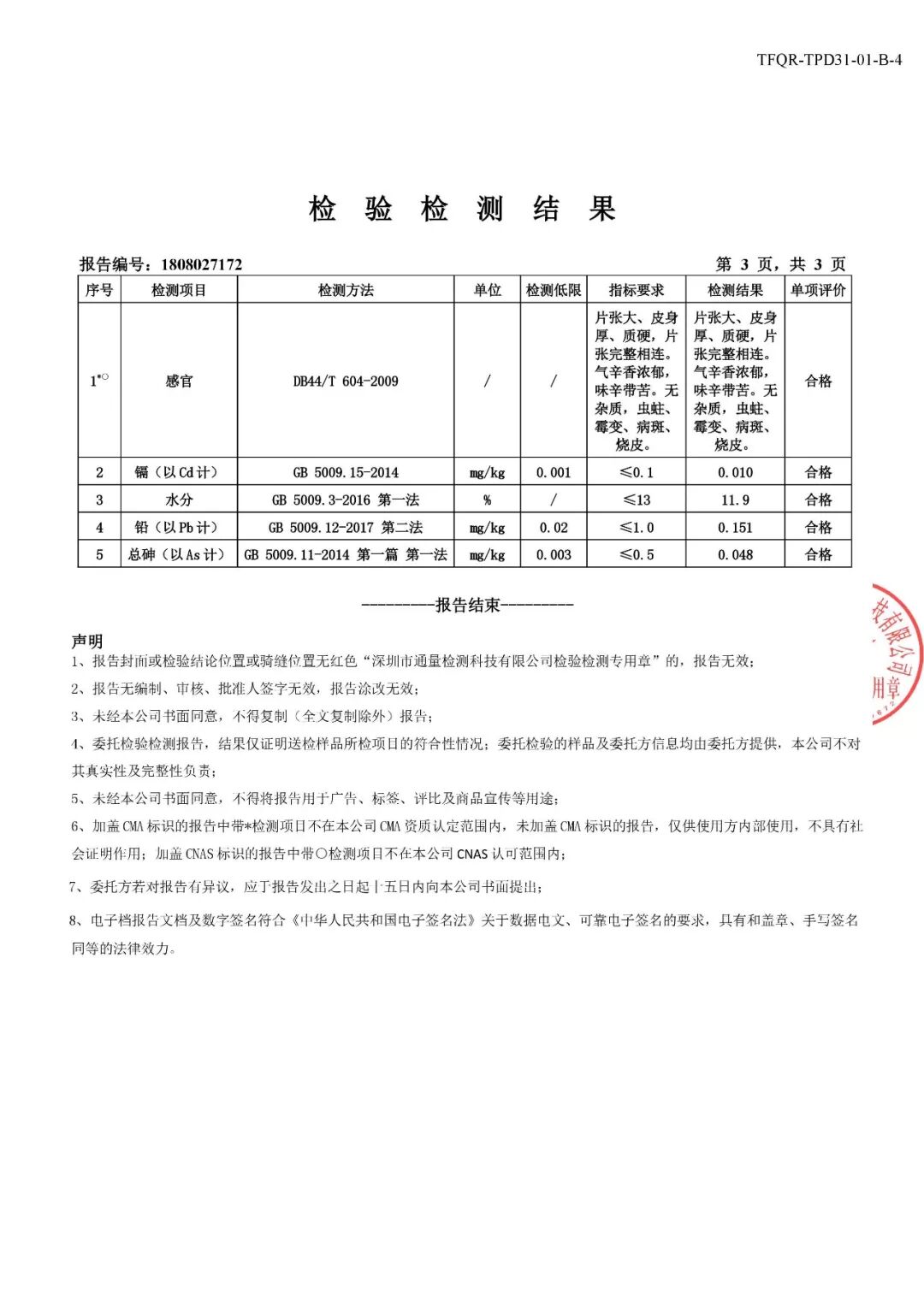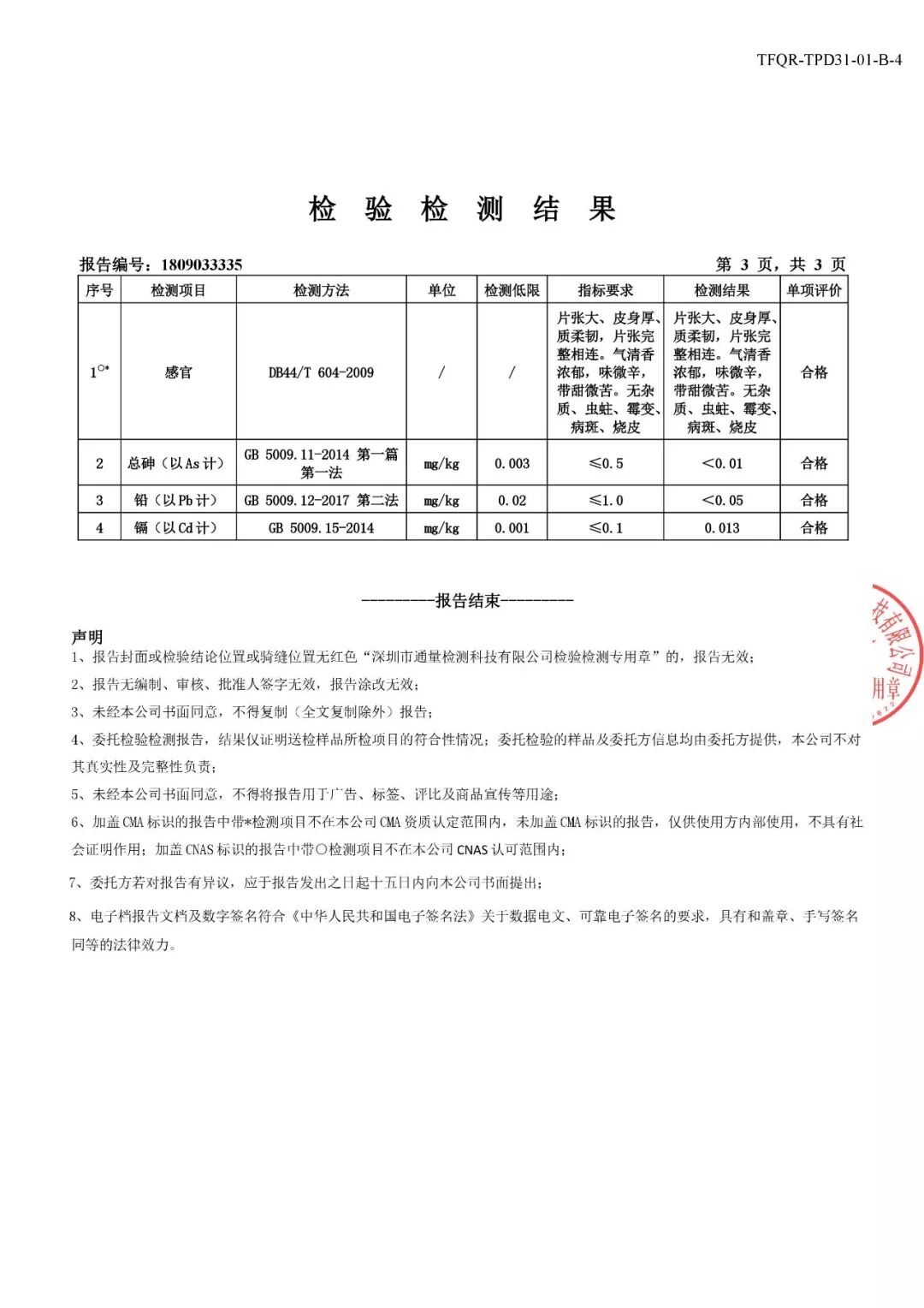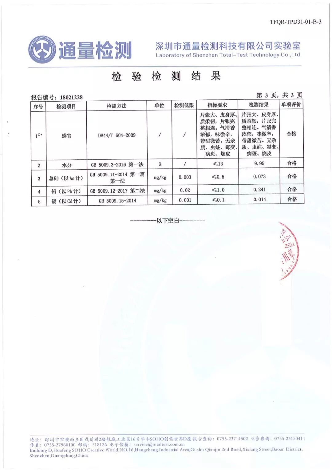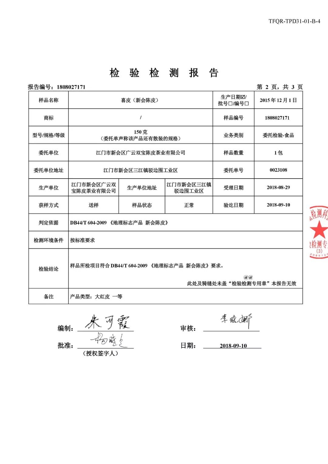 以下是廣云雙寶各款陳皮的質(zhì)檢證書呈現(xiàn):
