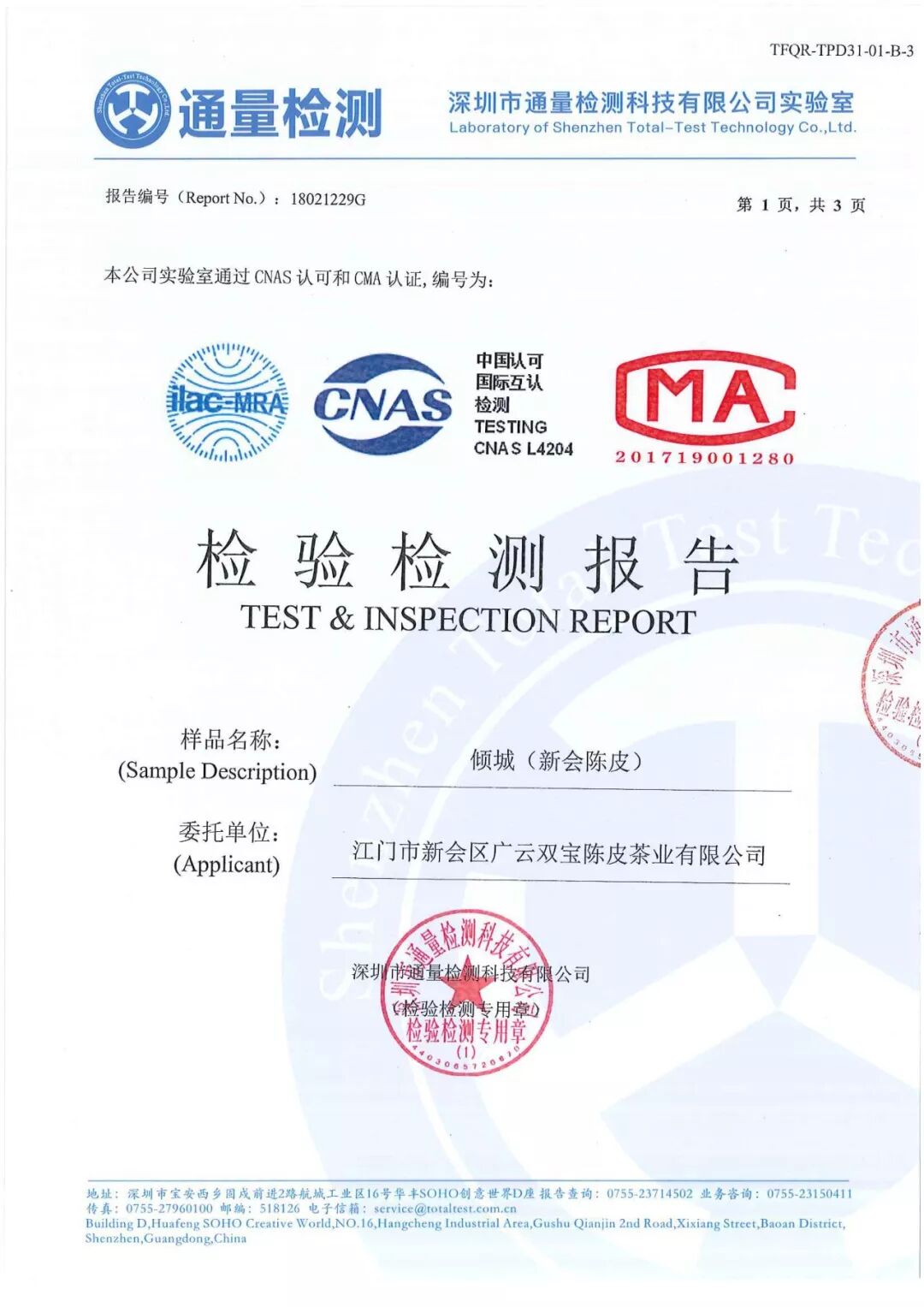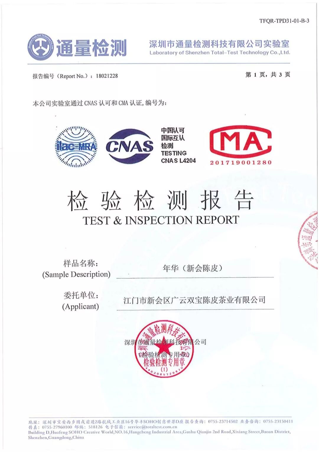 同時,廣云雙寶除了擁有專業(yè)的陳皮純干倉儲中心,為了讓消費者對我們的產(chǎn)品得到安心的體驗,我們每一款陳皮產(chǎn)品都送到深圳市通量檢測科技有限公司實驗室進行質(zhì)檢,保證我們陳皮產(chǎn)品質(zhì)量均符合標準要求。