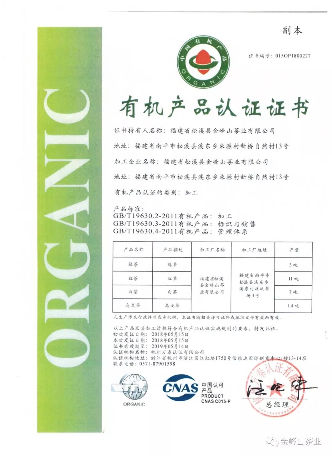 金峰山茶山采用有機(jī)管理,堅(jiān)持傳統(tǒng)人工除草耕作,人工翻土,從不用除草劑,不用農(nóng)藥和化肥,每年把修剪的茶樹枝放到根部堆肥,作為茶樹的天然肥料。金峰山生態(tài)有機(jī)茶園,采用栽培紫云英來(lái)維持茶園氮循環(huán),紫云英固氮能力強(qiáng),氮素利用效率也高,株體腐解時(shí)對(duì)土壤氮素的激發(fā)量很大,因而在等氮量條件下對(duì)后作的增產(chǎn)效果比苕子、蠶豆等綠肥作物強(qiáng)。金峰山有機(jī)茶園遵循傳統(tǒng)自然的生態(tài)平衡,其生長(zhǎng)環(huán)境連續(xù)七年通過了瑞士IMO國(guó)際認(rèn)證,符合歐洲EU、美國(guó)NOP有機(jī)茶標(biāo)準(zhǔn),是國(guó)家級(jí)農(nóng)業(yè)標(biāo)準(zhǔn)化示范基地。公司旗下有機(jī)茶園溪東周墩“金峰山茶業(yè)有機(jī)茶基地”(14公頃年產(chǎn)茶鮮葉產(chǎn)量105噸)于2017年12月14日取得萬(wàn)泰認(rèn)證有機(jī)產(chǎn)品認(rèn)證證書(證書編號(hào):015OP1700779)。在生產(chǎn)加工方面,“福建省松溪縣金峰山茶業(yè)有限公司”“綠茶、紅茶、白茶、烏龍茶”于2018年5月15日取得萬(wàn)泰認(rèn)證有機(jī)產(chǎn)品認(rèn)證證書(證書編號(hào):015OP1800227)。金峰山茶葉經(jīng)過112項(xiàng)農(nóng)殘檢測(cè),結(jié)果全部未檢出。金峰山茶業(yè)以自有基地為依托,以“有機(jī)”為產(chǎn)品恒定標(biāo)準(zhǔn),依據(jù)日本、歐盟等進(jìn)口國(guó)及市場(chǎng)的農(nóng)殘標(biāo)準(zhǔn),制定了一套科學(xué)嚴(yán)謹(jǐn)?shù)霓r(nóng)殘控制體系,建立起了完善的基地備案和產(chǎn)品可追溯體系。關(guān)注從茶園到茶杯的每個(gè)細(xì)節(jié),茶葉整體加工采用全封閉式無(wú)菌機(jī)械化作業(yè),著力打造讓消費(fèi)者值得信賴的自然安全,健康品位的品牌。金峰山茶業(yè)本著“客戶至上”的服務(wù)宗旨,不斷加強(qiáng)技術(shù)力量的投入,進(jìn)一步提高生態(tài)茶葉質(zhì)量,竭誠(chéng)滿足客戶的需求。