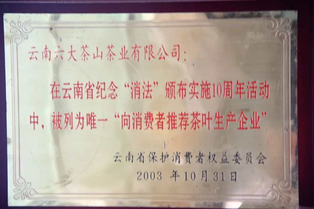 2003年10月,云南六大茶山茶業(yè)股份有限公司被云南省保護消費者權益委員會列為唯一“向消費者推薦茶葉生產企業(yè)”。