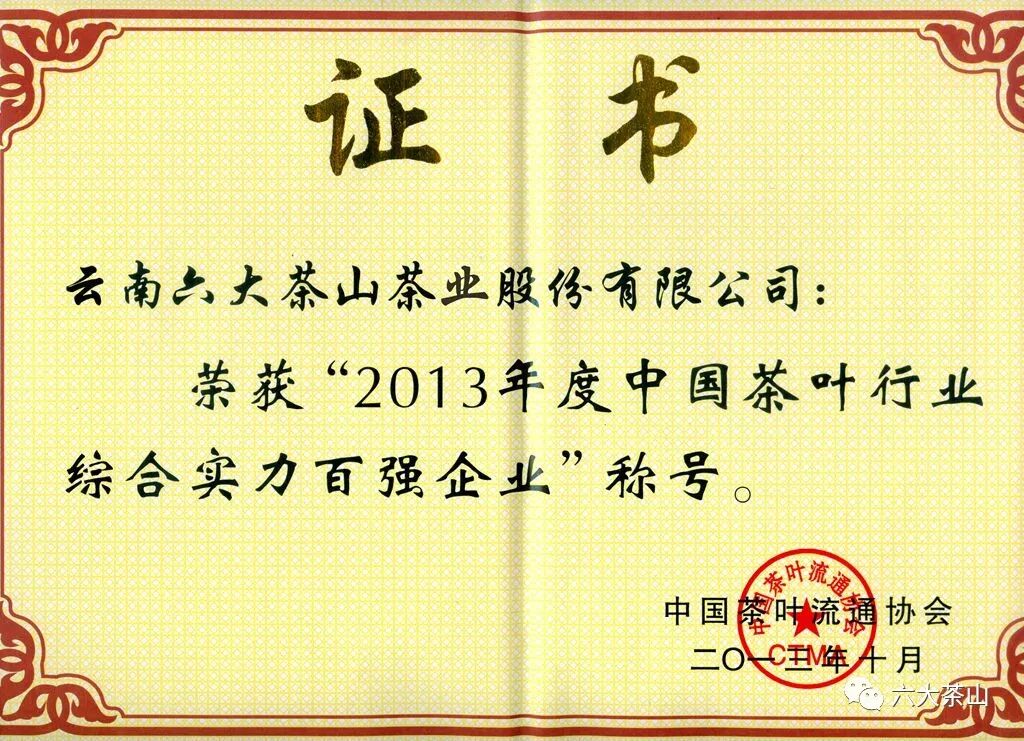 2013年10月,第九屆中國茶業(yè)經濟年會暨首屆中國(岳陽)黃茶文化節(jié)于2013年10月29-31日舉行。云南六大茶山茶業(yè)股份有限公司入選“2013年中國茶葉行業(yè)百強企業(yè)”。與此同時,云南六大茶山茶業(yè)股份有限公司董事長阮殿蓉女士榮獲“2013中國茶葉行業(yè)十大年度經濟人物”。