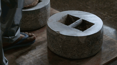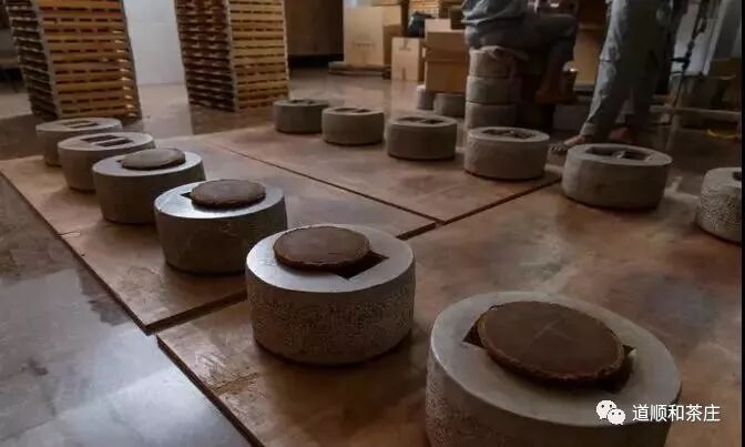再用25公斤重的石磨來壓茶,使茶成餅形。因是人工石墨壓制,餅型偶有不規(guī)則,也是正常的。