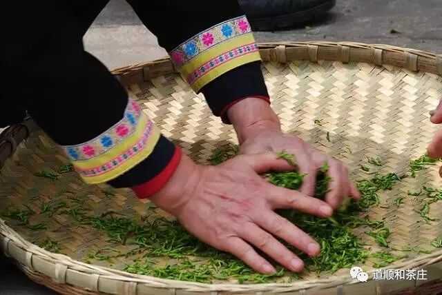 ? ? ? ? 殺青好的茶葉就可以從鐵鍋中倒出,在揉捻臺(tái)上攤涼至尚有余溫,然后再人工用手對茶葉進(jìn)行“揉”和“捻”。
