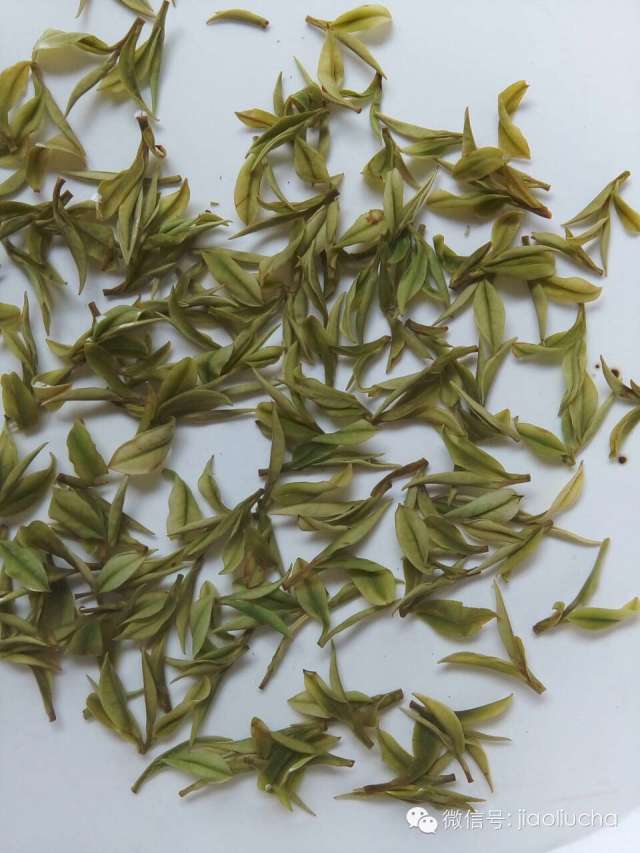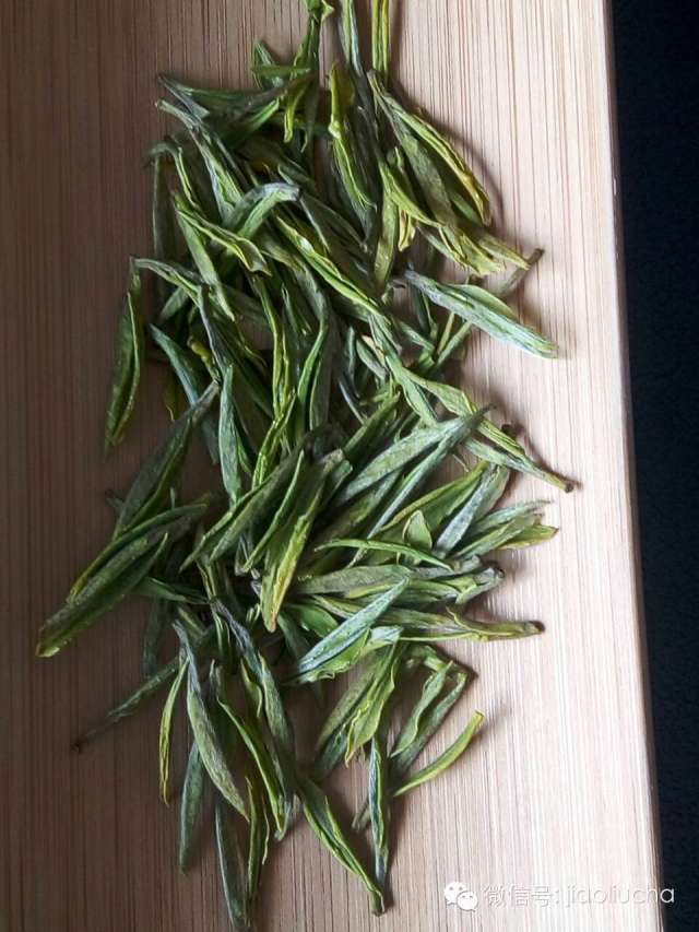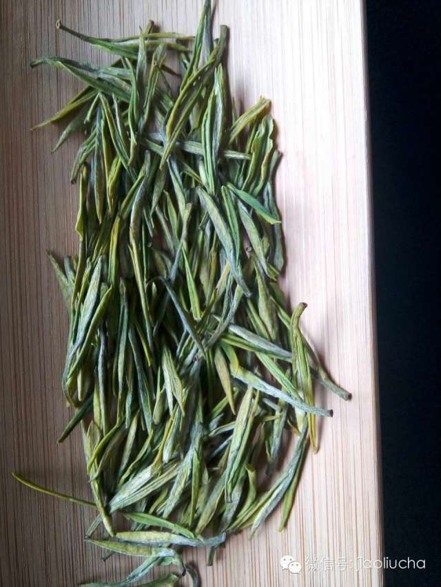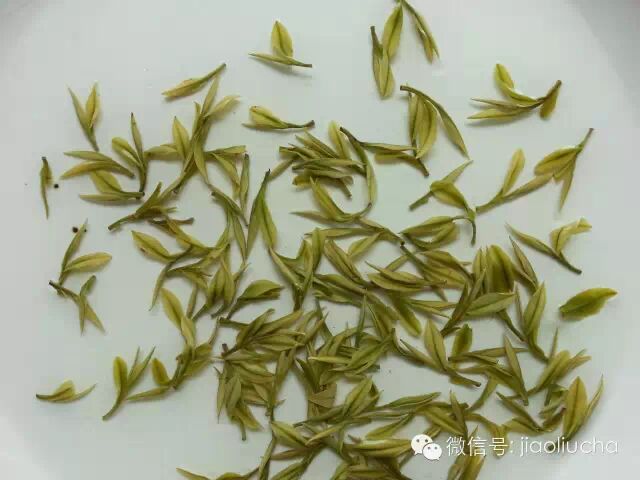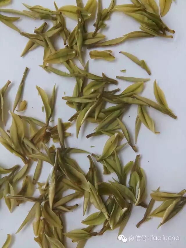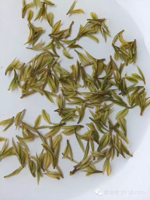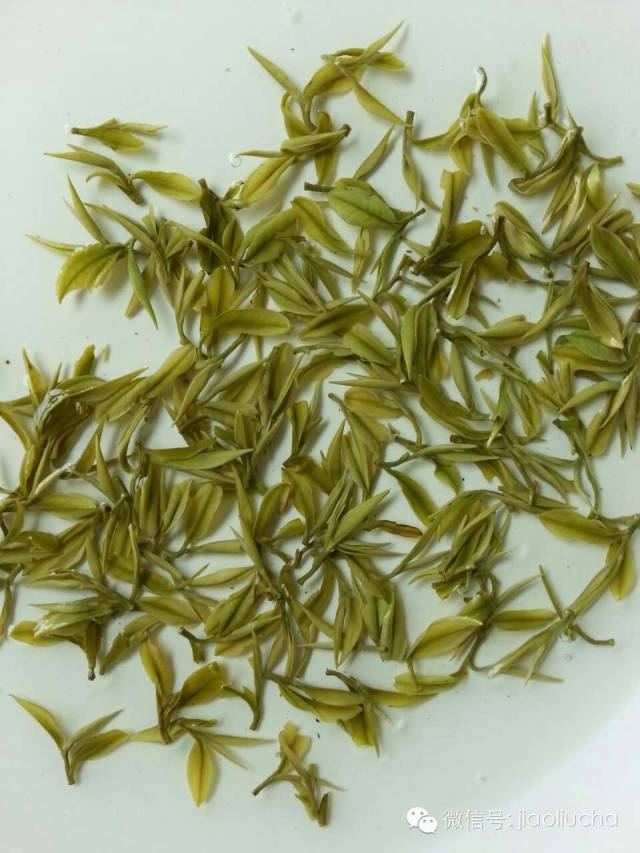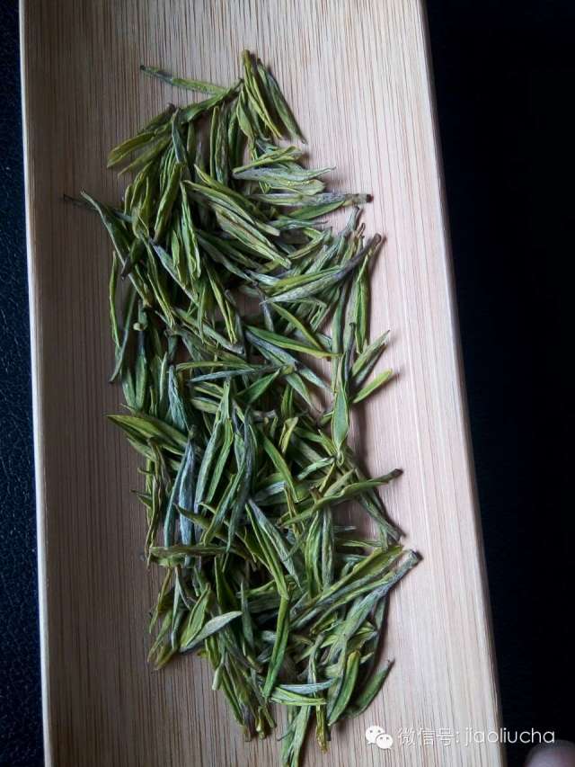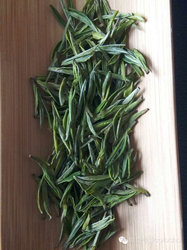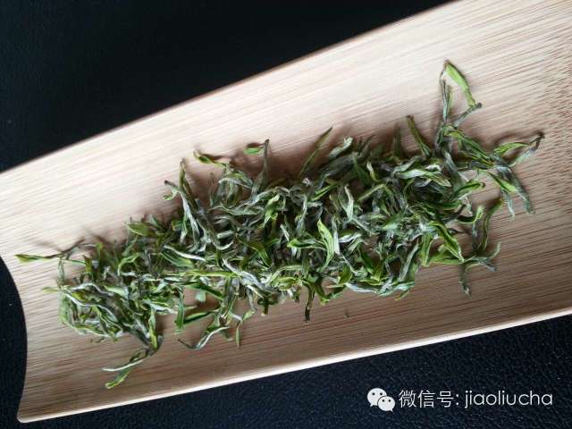 第二款:芽頭肥壯,白豪顯露,色澤翠綠泛金邊,葉緣卷起,挺直略扁,芽長于葉。