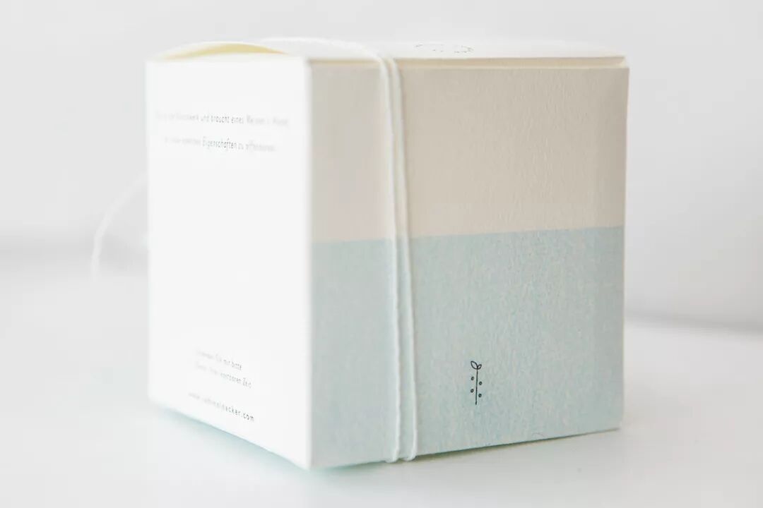 包裝以白色特種紙為主,正面在黃金分割的區(qū)域過渡出水墨質(zhì)感的色彩,包裝整體干干凈凈,具有一種讓人感到放松的視覺感受。