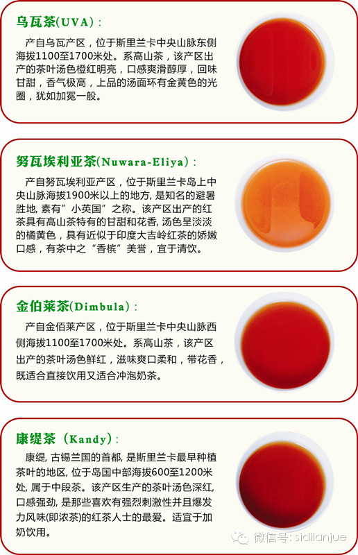 斯里蘭卡每年生產(chǎn)約25萬噸茶葉,茶的種植基地僅限于島國的中央和南部低地。茶葉按生長的海拔高度不同分為三類,即高地茶、中段茶和低地茶。斯迪蘭爵紅茶的4個產(chǎn)區(qū)包括烏瓦(UVA)、康緹(Kandy)、金伯萊(Dimbula)、努瓦艾利亞(Nuwara-Eliya)。各產(chǎn)地因海拔高度、氣溫、濕度的不同,所出產(chǎn)的茶葉外觀,湯色香氣和口感均有不同特色。